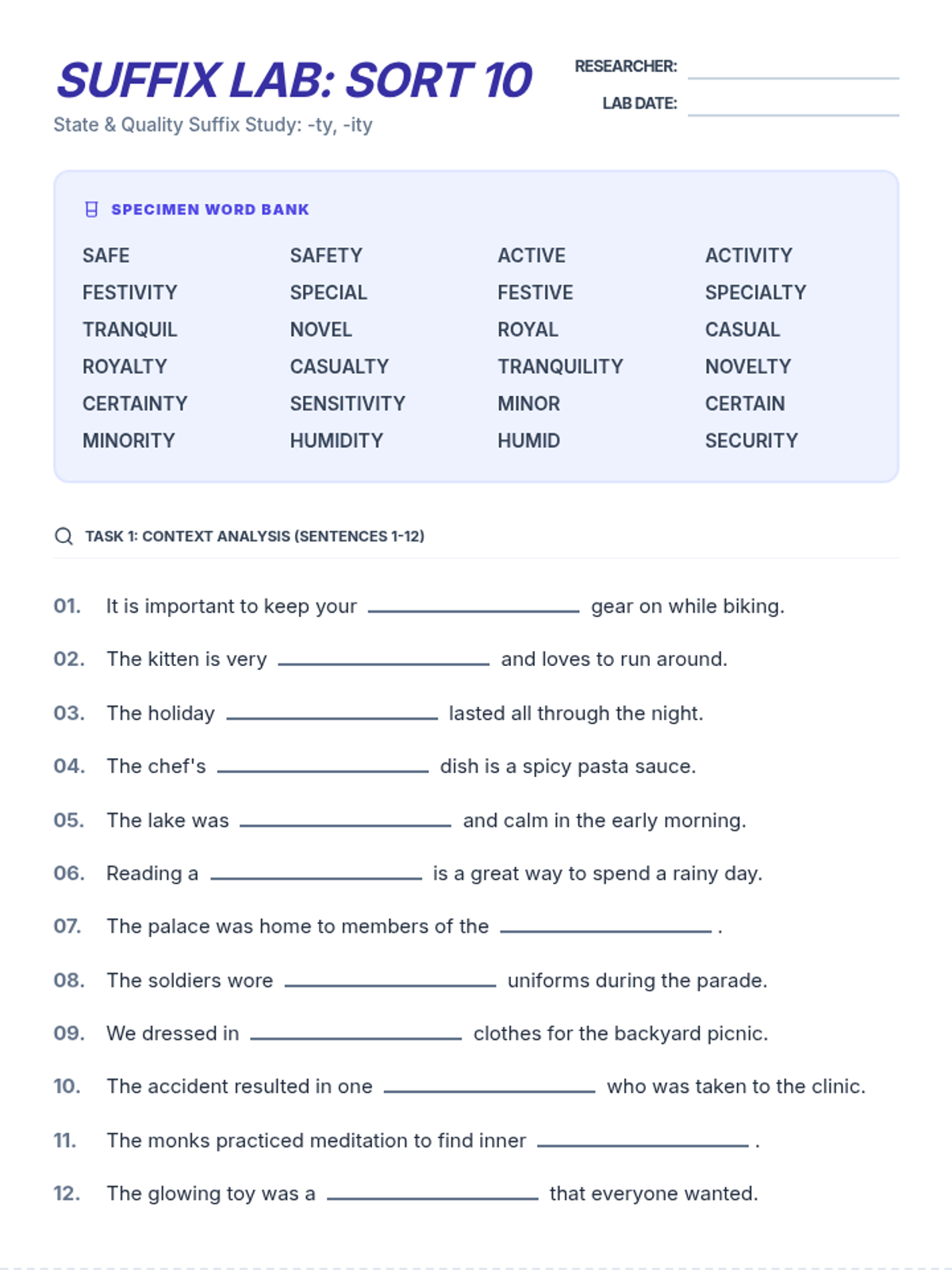 A 3-page printable packet for Sort 10 (-ty, -ity). Includes 24 fill-in-the-blank sentences across two pages, followed by a logic page with 6 word unscrambles and a functional 12x12 crossword puzzle.