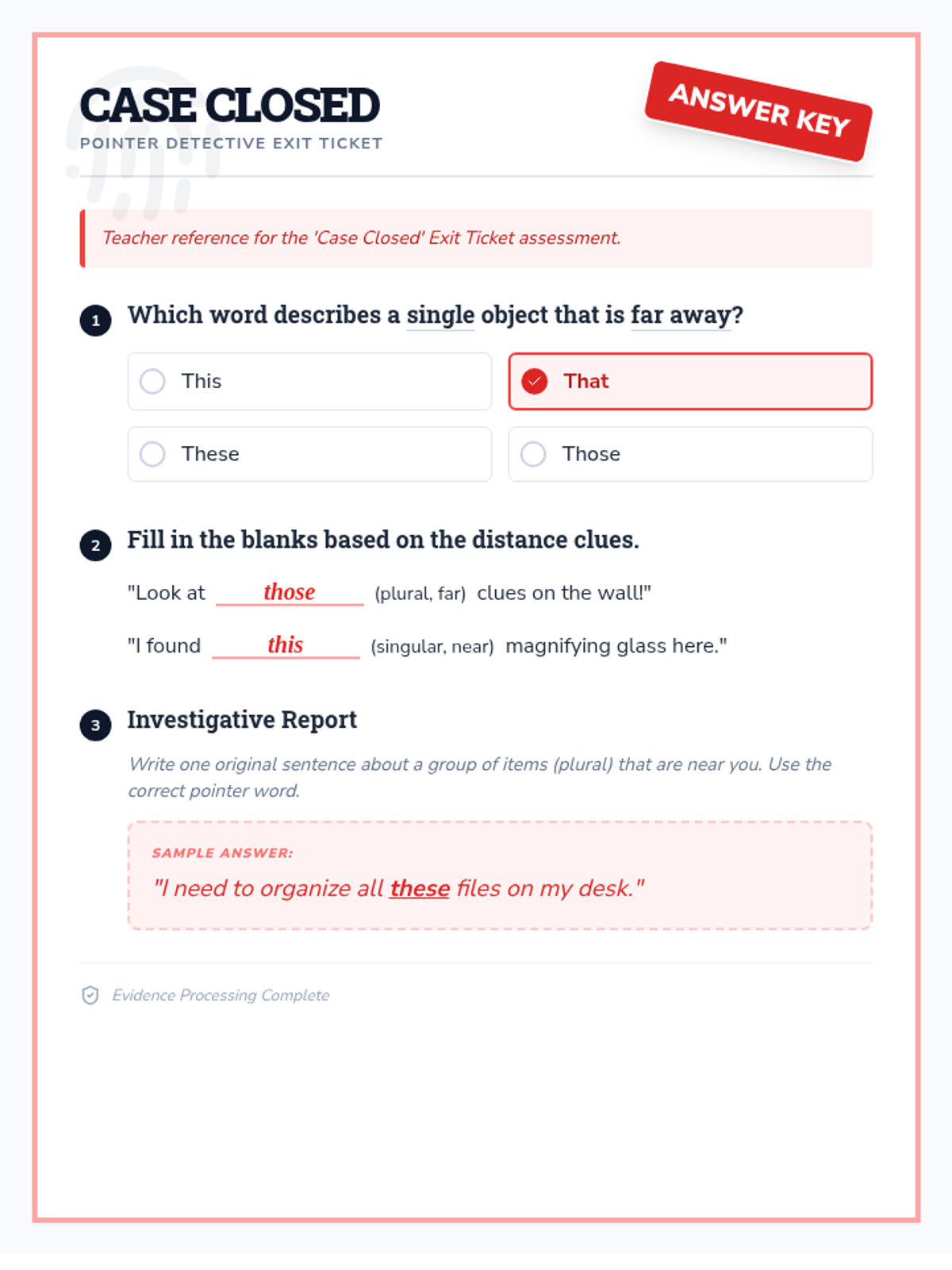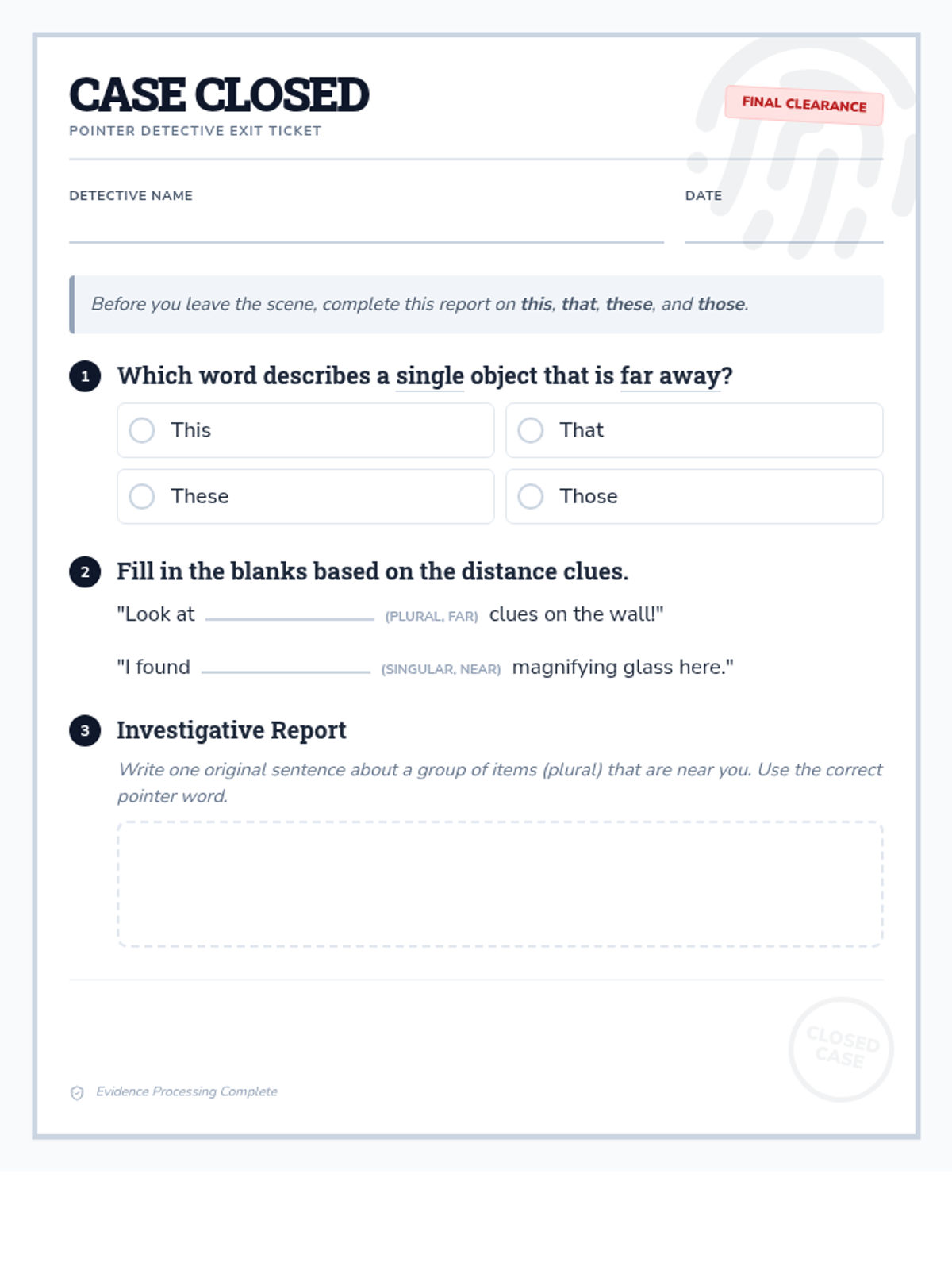 A detective-themed exit ticket titled 'Case Closed' that assesses student mastery of demonstrative pronouns (this, that, these, those) through multiple choice, fill-in-the-blank, and sentence writing exercises.