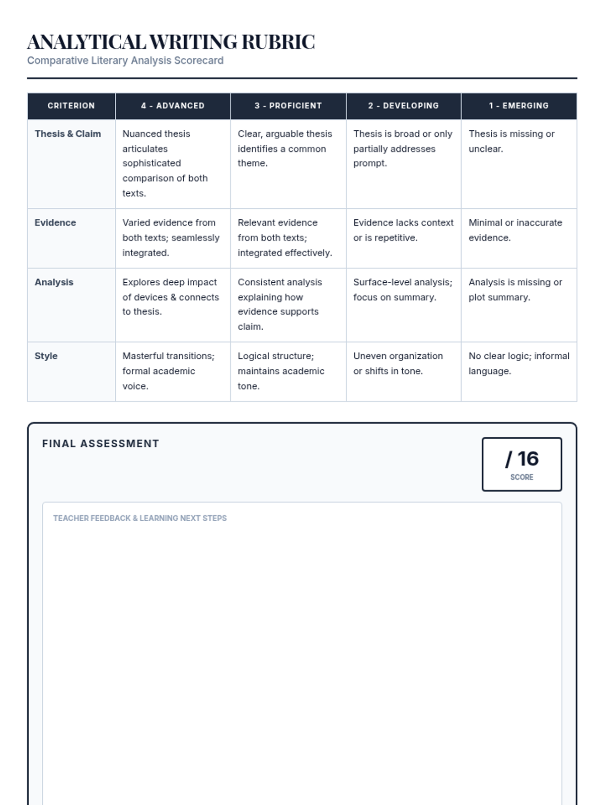 A professional 4-point analytical writing rubric used to grade the comparative literary analysis. It covers Thesis, Evidence, Analysis, and Organization, providing clear descriptors for Advanced, Proficient, Developing, and Emerging levels.