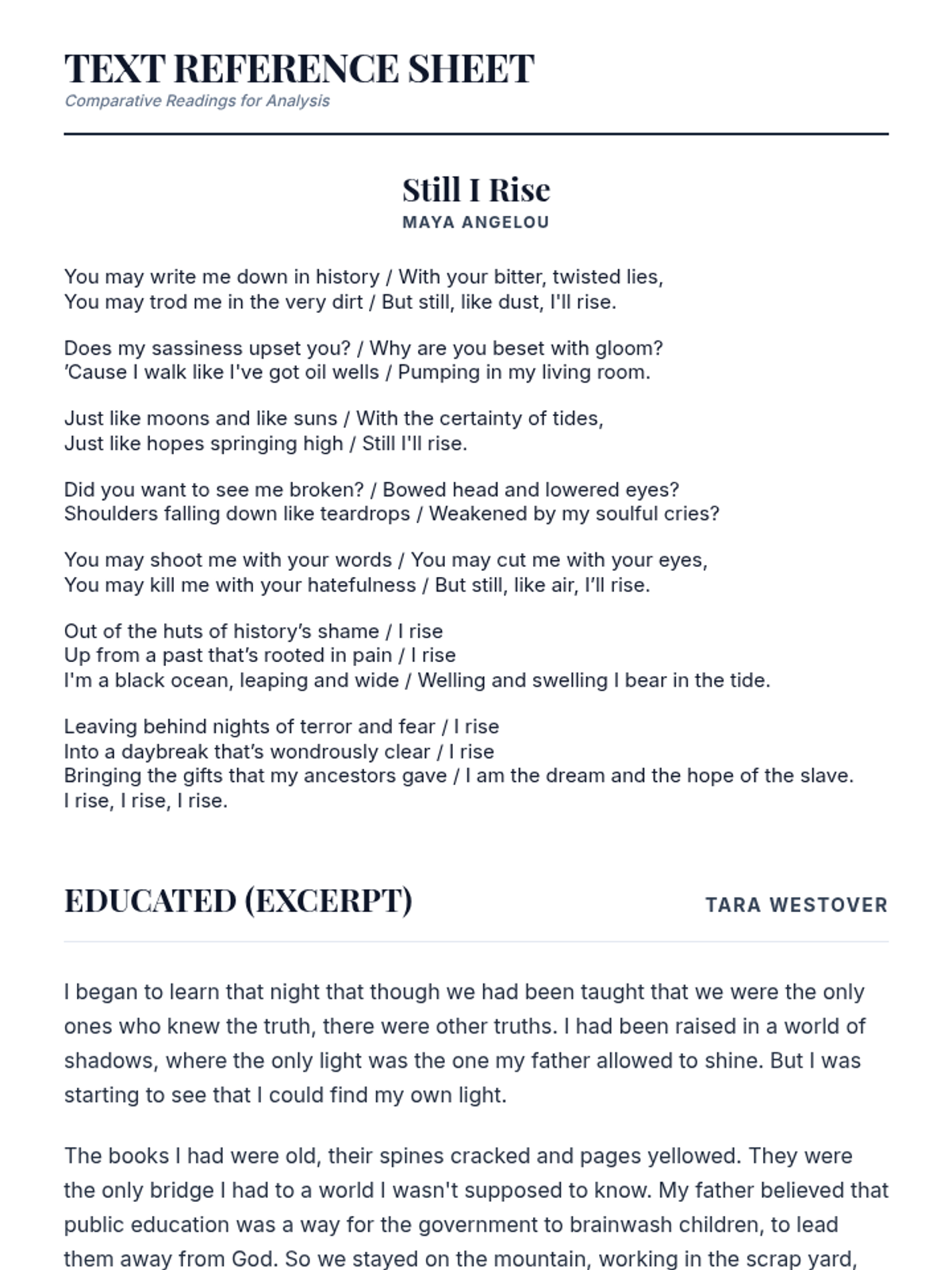 A reference sheet providing the text of Maya Angelou's poem 'Still I Rise' and a curated excerpt from Tara Westover's memoir 'Educated' for use in the comparative analysis assessment.