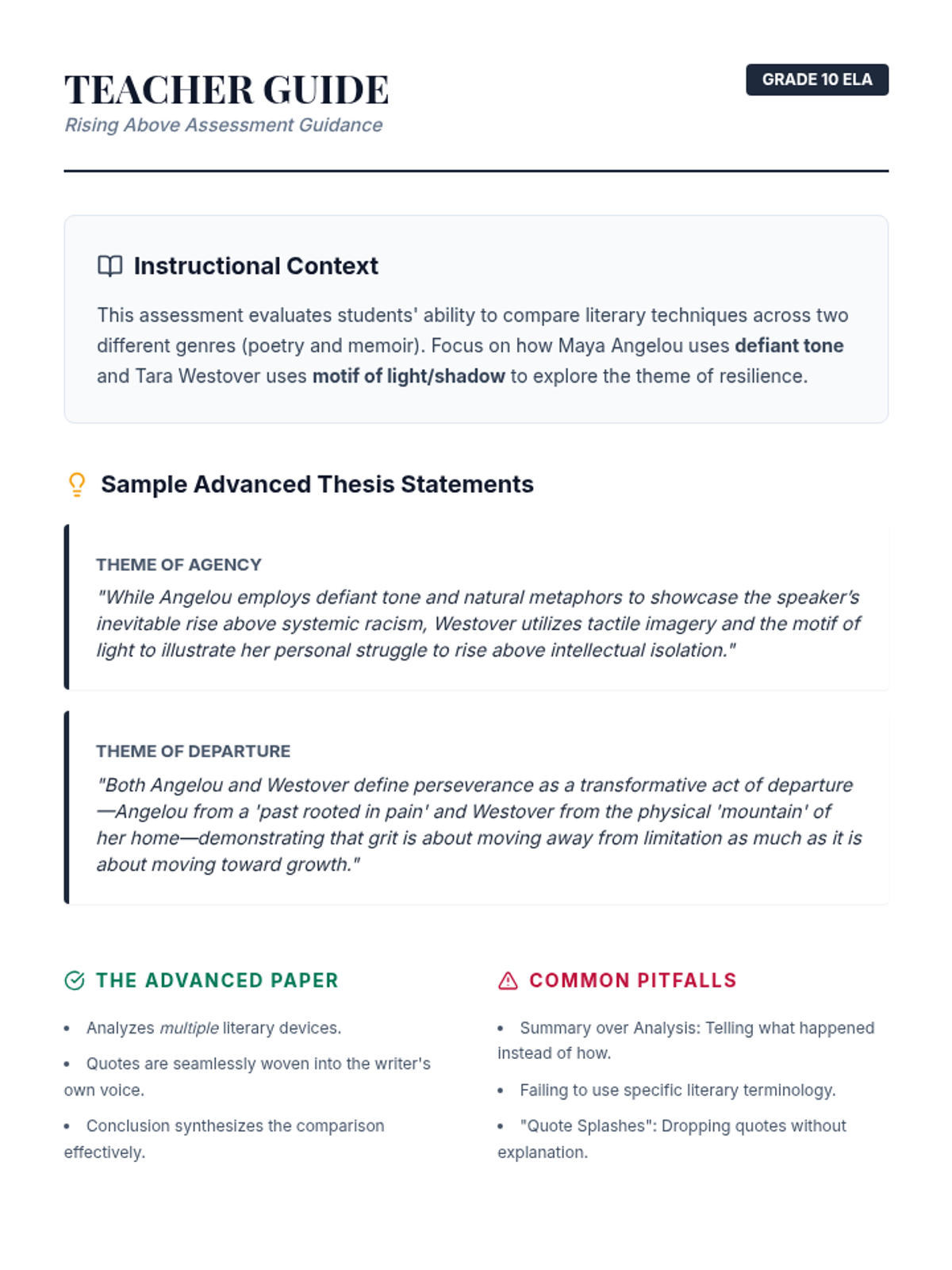 A teacher-facing guide for the comparative literary analysis assessment. It includes instructional context, suggested pacing, sample advanced thesis statements, and scoring calibration notes to help teachers grade consistently.