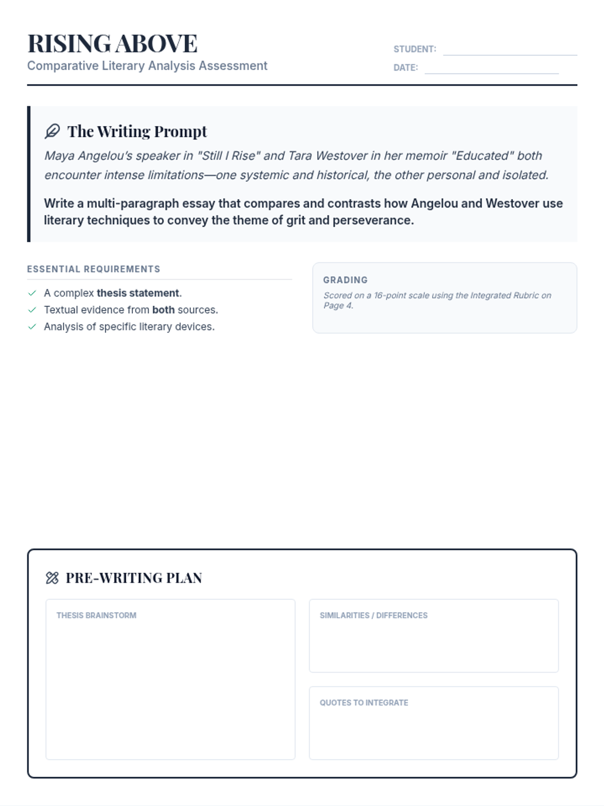 A student-facing assessment sheet for a comparative literary analysis essay on Angelou and Westover. It includes the writing prompt, requirements, and a structured planning space for students to brainstorm their thesis and evidence.