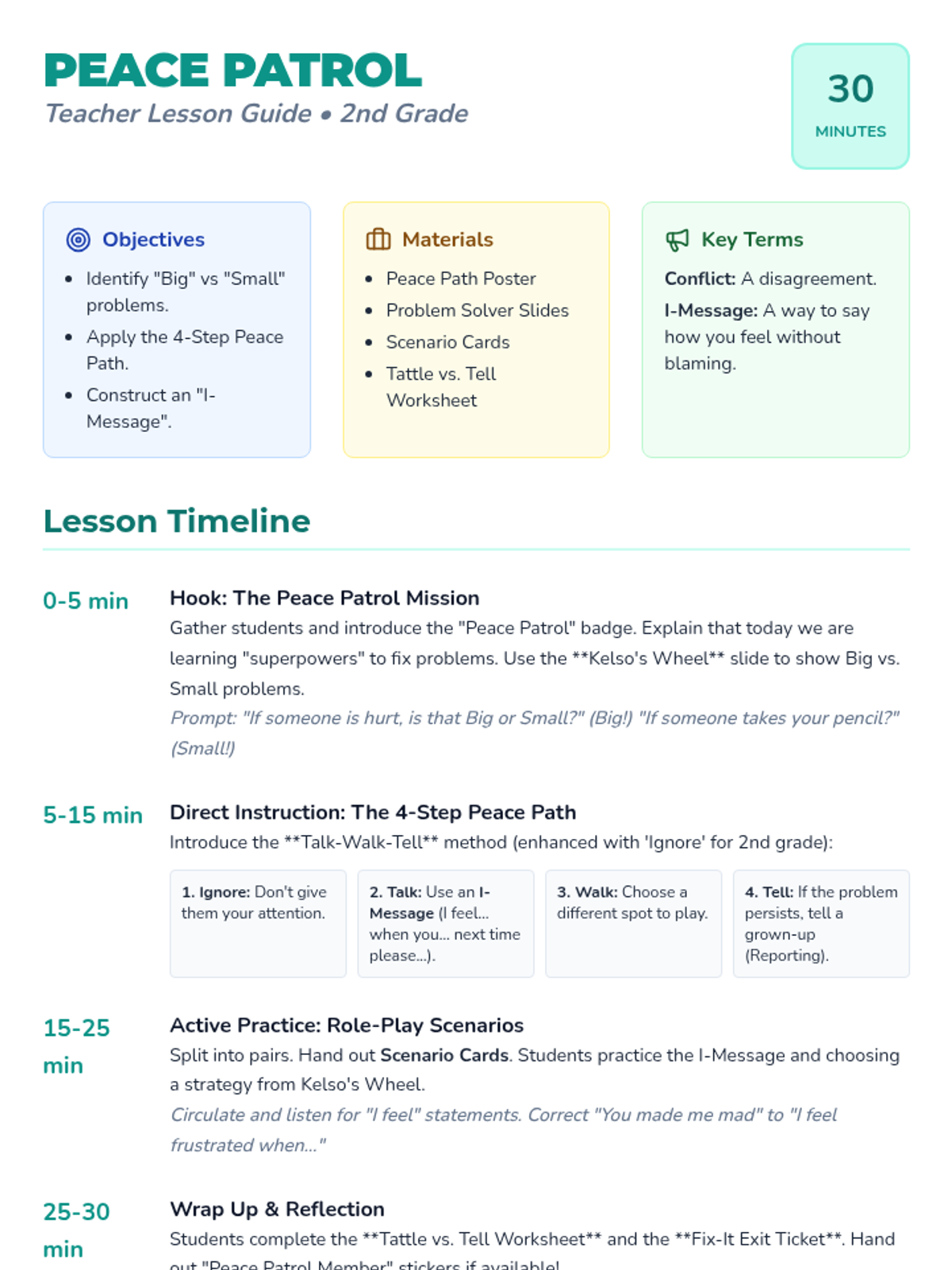 A teacher's lesson guide for a 30-minute conflict resolution session featuring the Peace Patrol theme and 4-step Peace Path.