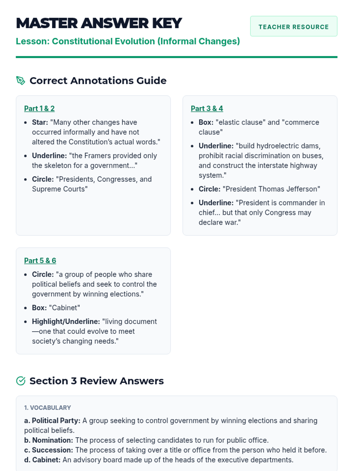 A master answer key for the Constitutional Evolution lesson, providing correct student annotations, sample responses for the section review, and a criteria for mastery for the final critical thinking task.