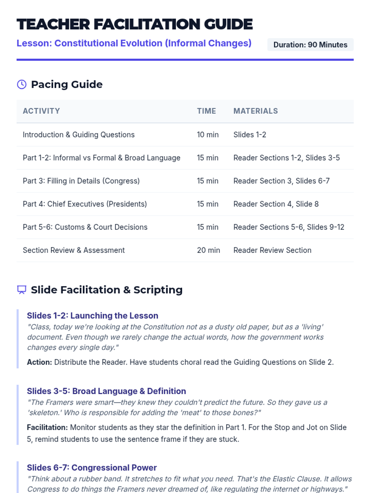 A comprehensive teacher facilitation guide for the Constitutional Evolution lesson, including a 90-minute pacing guide, slide-by-slide scripts, LEP/IEP scaffolding strategies, and common student misconceptions.