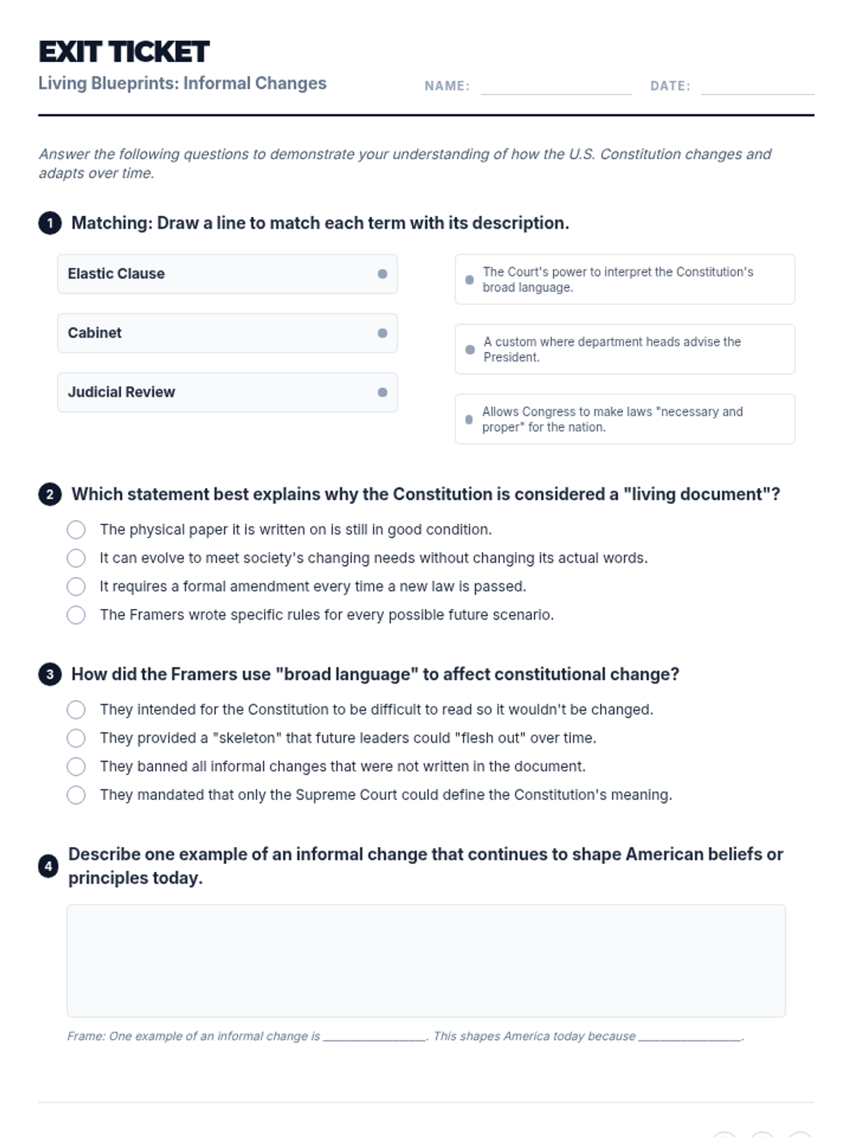 A 4-question formative assessment exit ticket for the Constitutional Evolution lesson, assessing student understanding of informal changes, the "living document" concept, and the role of broad language in constitutional adaptation.