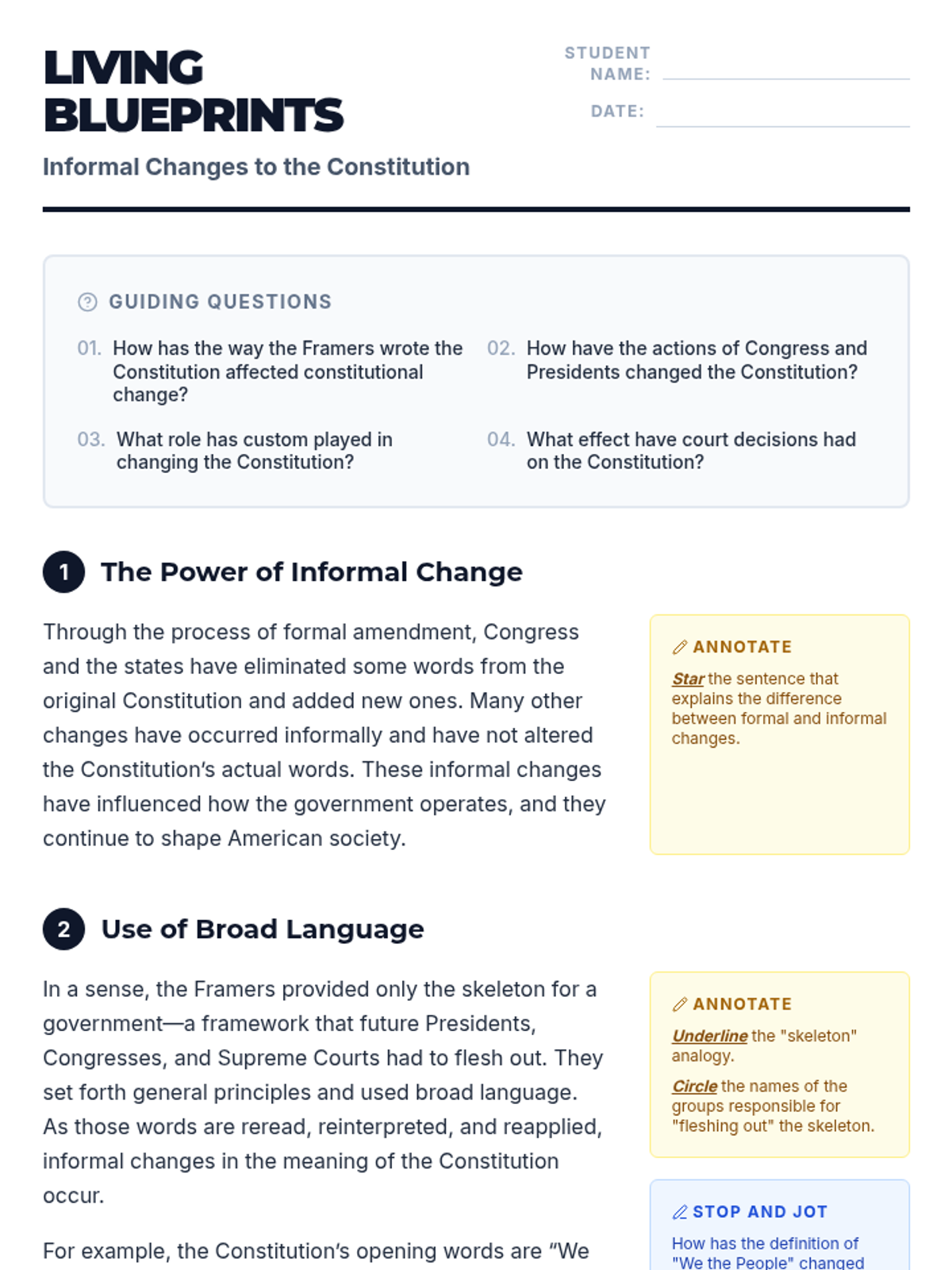 A comprehensive student reader for 10th-grade Government on informal constitutional changes, featuring chunked text, varied annotation tasks, integrated writing and discussion prompts, and a full section review with sentence frames.
