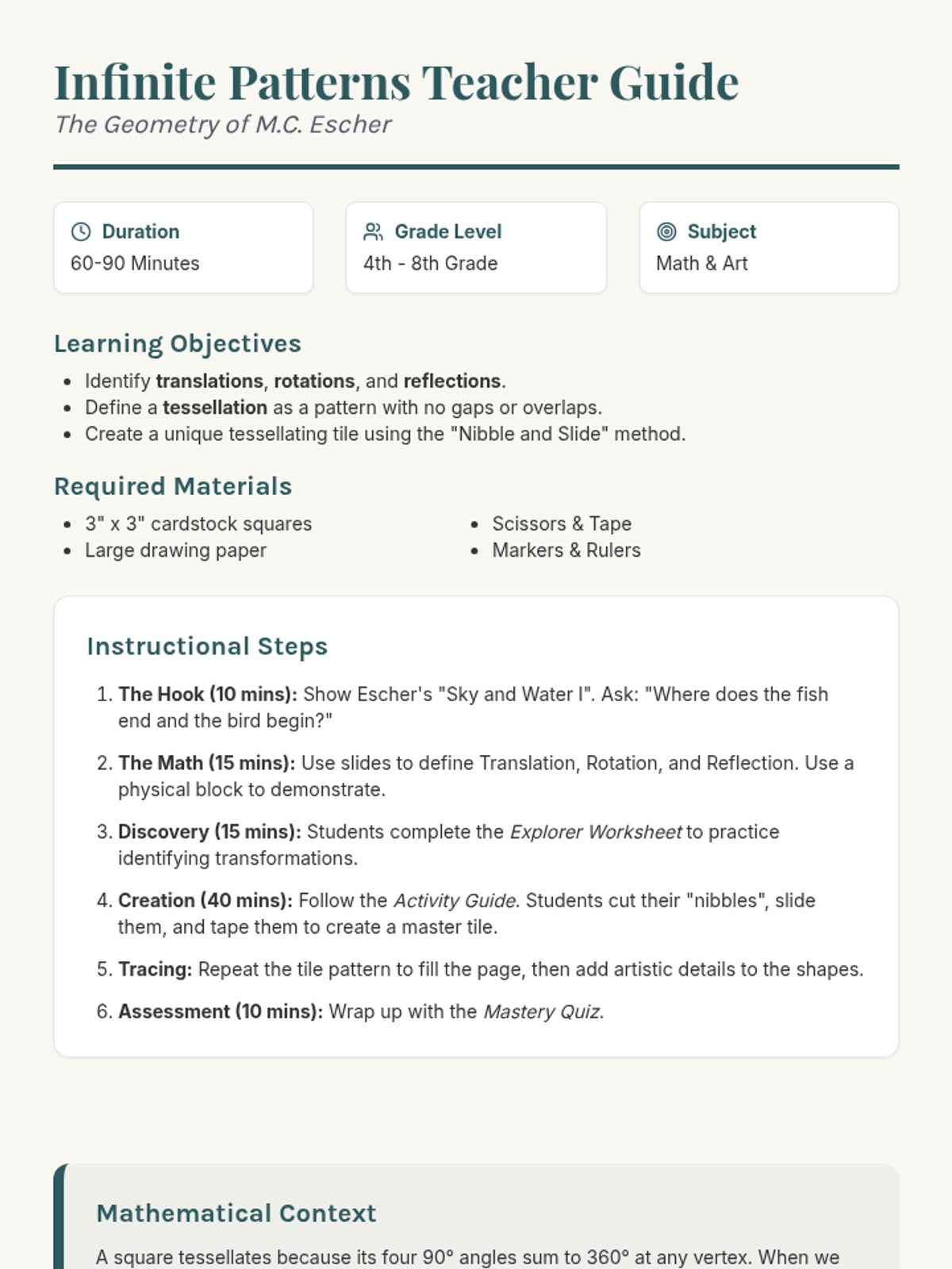 A comprehensive instructional guide for teachers, providing learning objectives, materials lists, step-by-step procedures, and mathematical background for teaching M.C. Escher-inspired tessellations.