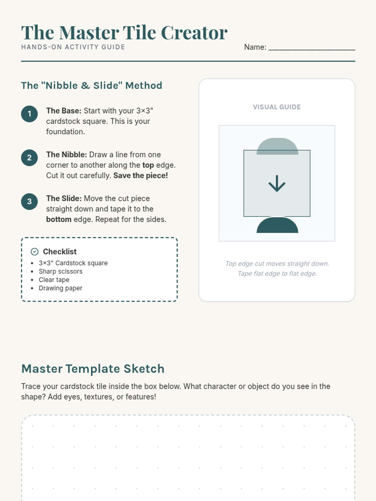 An activity guide that provides a step-by-step tutorial on the 'Nibble and Slide' translation method for creating a custom tessellation tile, including a workspace for students to draft their design.