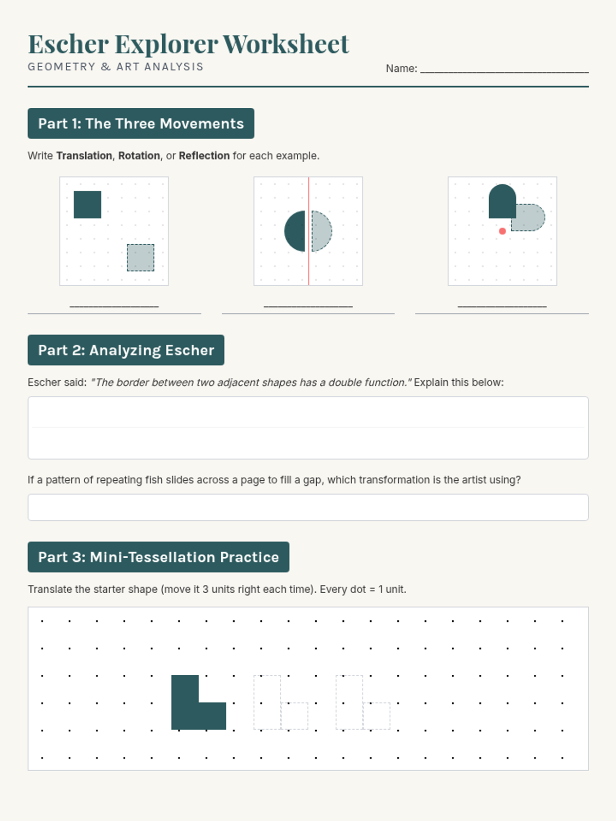 A practice worksheet for students to identify transformations (translation, rotation, reflection), analyze Escher's concepts, and practice a simple translation tessellation on a grid.