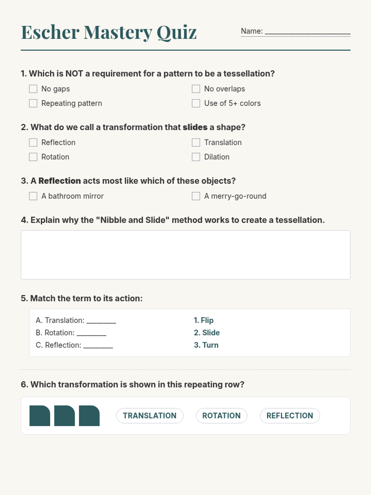 A assessment tool containing multiple-choice, matching, and short-answer questions to evaluate student understanding of tessellations and geometric transformations.