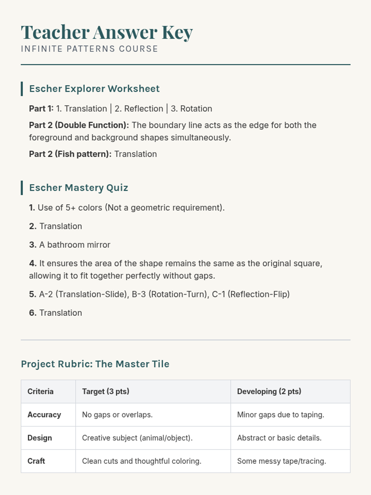 A teacher's resource providing correct answers for the Escher Explorer Worksheet and Mastery Quiz, along with a grading rubric for the final tessellation project.