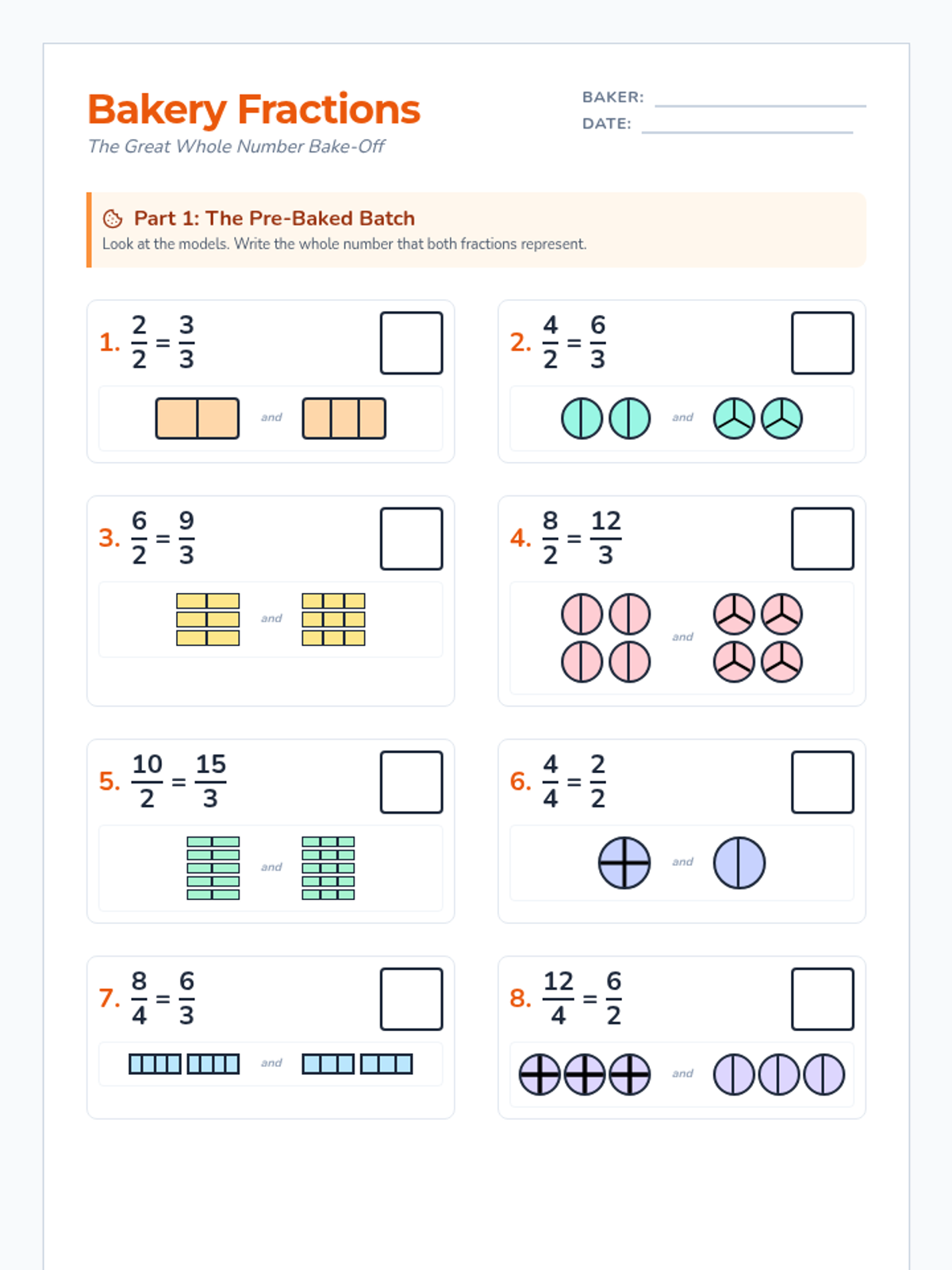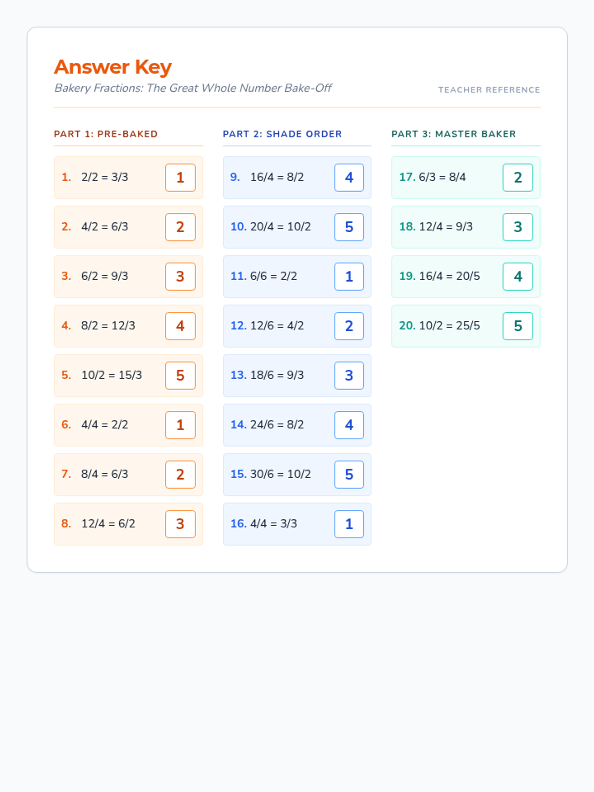 Answer key for the Bakery Fractions worksheet, providing the whole number equivalents for all 20 practice problems in a condensed 1-page format. Fixes spacing and font size for better legibility.