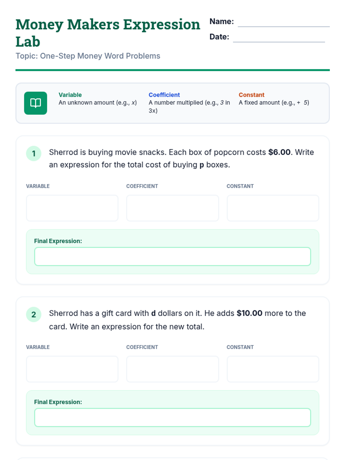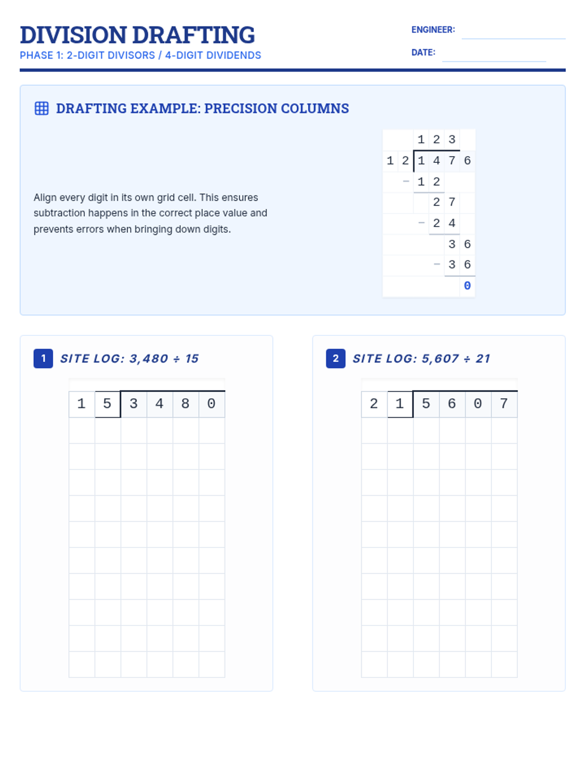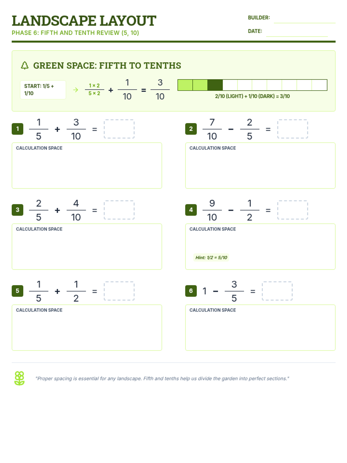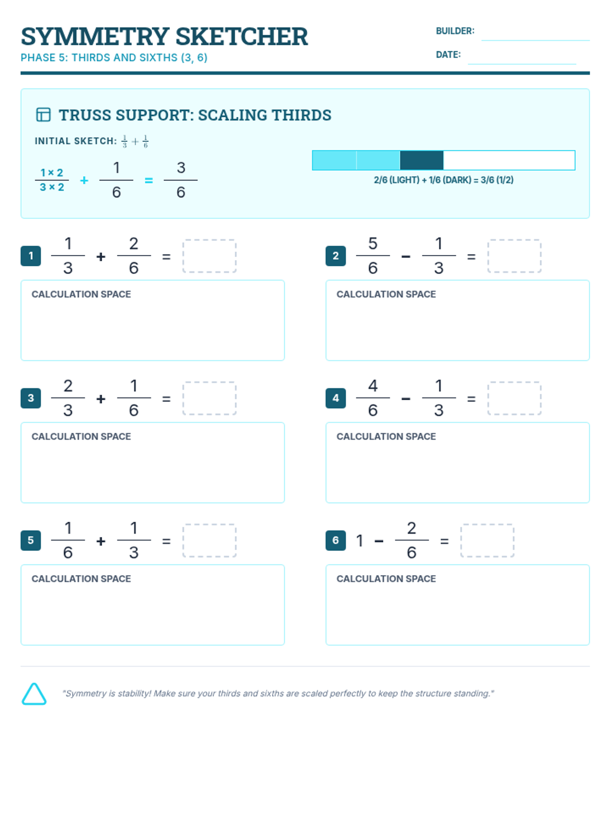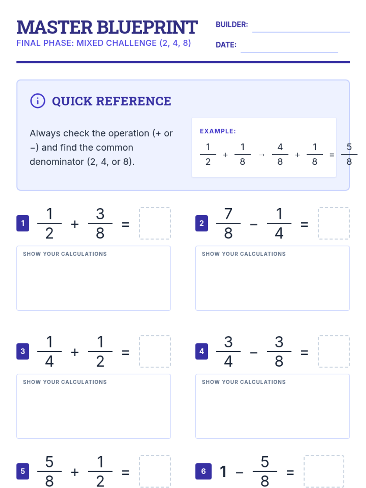 A blacksmith-themed math worksheet for monitoring progress in adding and subtracting proper and improper fractions using the least common denominator. Includes dedicated workspace for finding the LCD and final computation for 10 problems. Optimized layout to keep problems whole on each page.