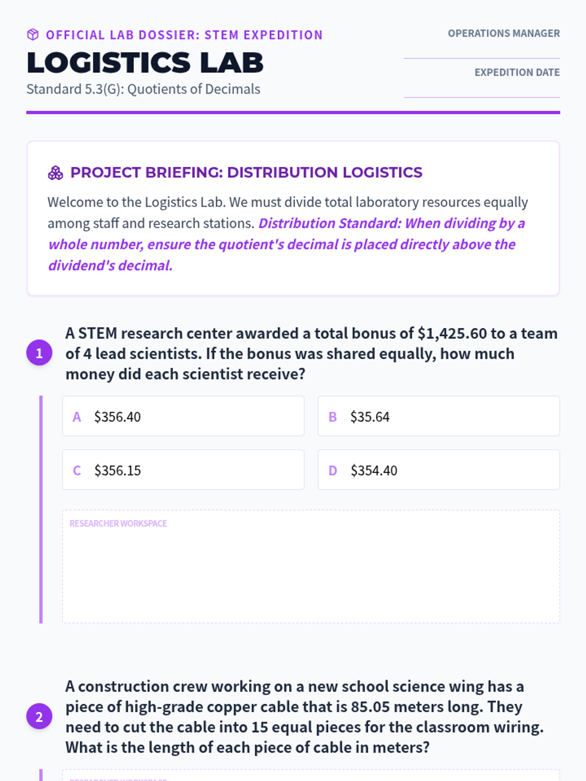 Day 4 practice set for decimal division (5.3G) using STEM logistics and distribution themes. Includes a bubble-griddable item.