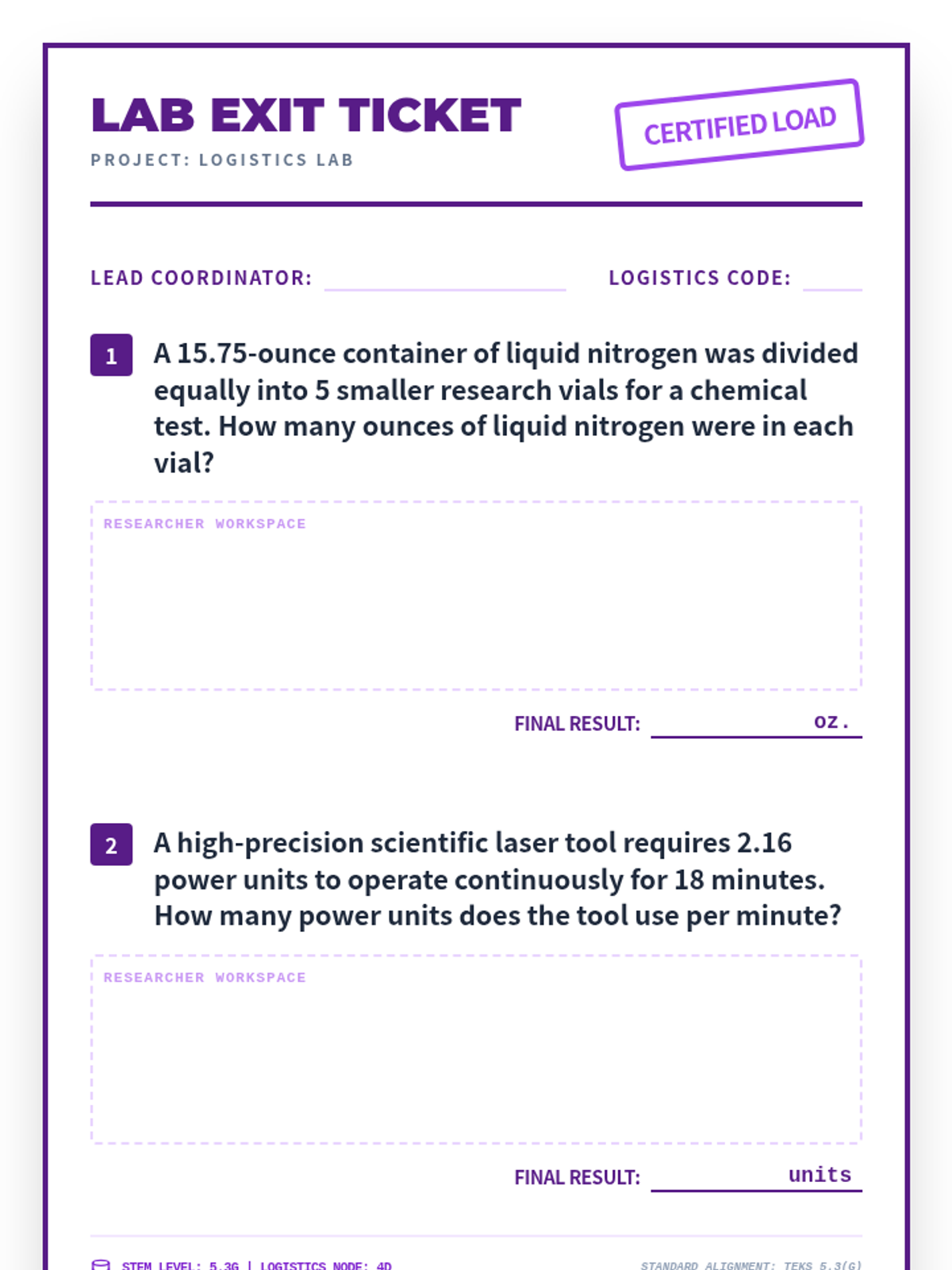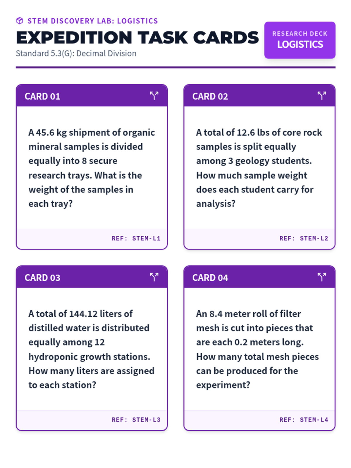 8 mission-themed decimal division word problem task cards for Day 4 (5.3G) using a STEM logistics theme. Includes a recording sheet for coordination log entries.