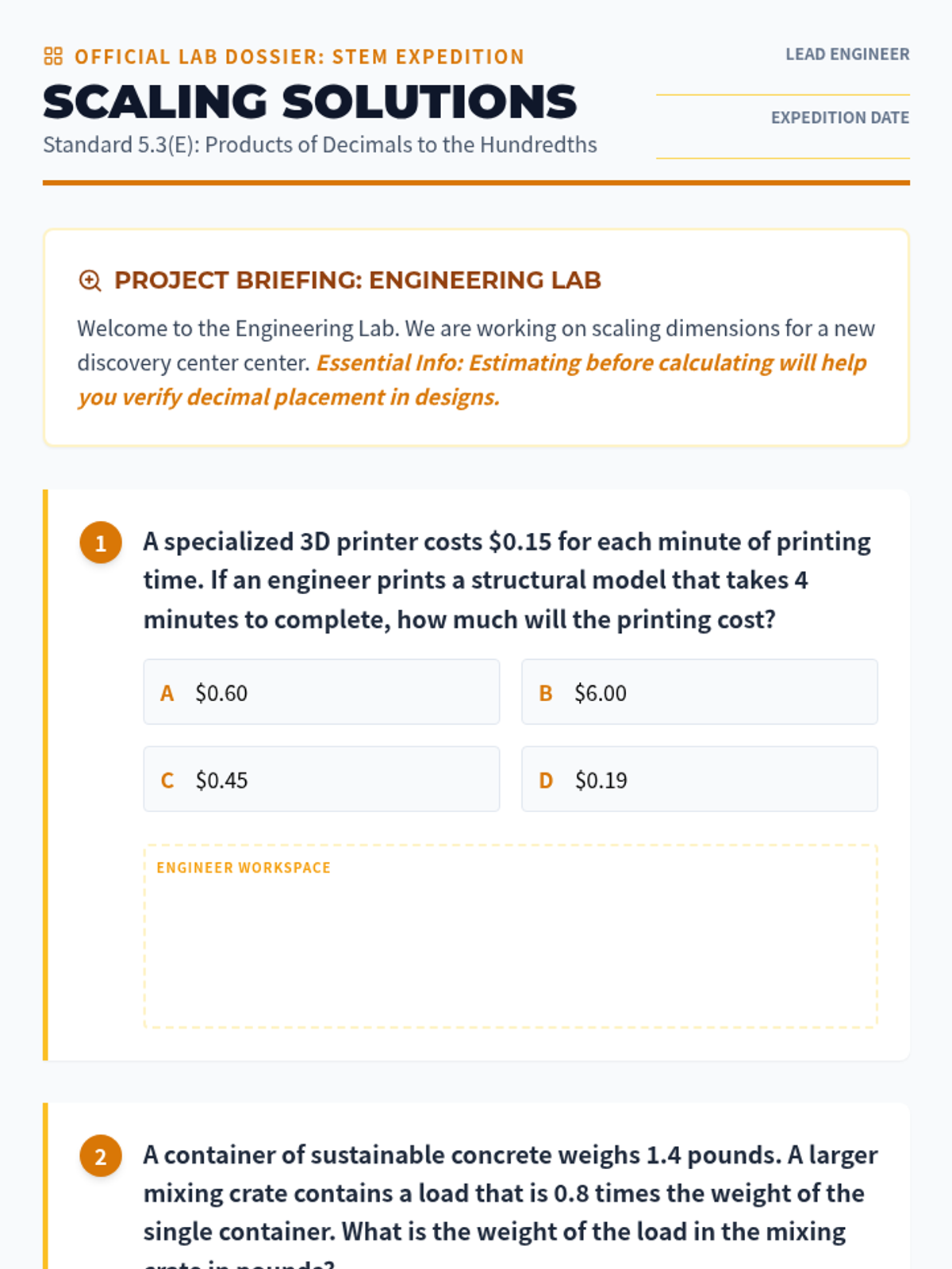 Day 3 practice set for decimal multiplication (5.3E) with corrected area models and STEM engineering contexts. Fixed page breaks and label consistency. Includes 3 rigorous word problems.