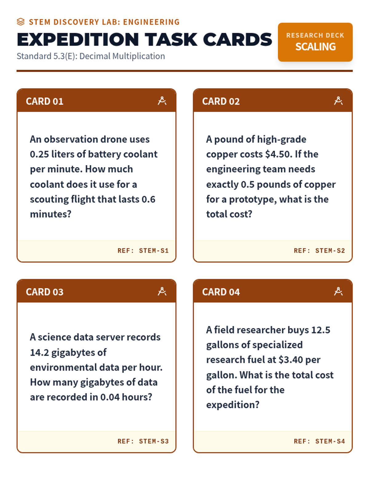 8 mission-themed decimal multiplication word problem task cards for Day 3 (5.3E) using a STEM scaling theme. Includes a single-page recording sheet with result lines and consistent formatting. Fixed page break and repeated header.