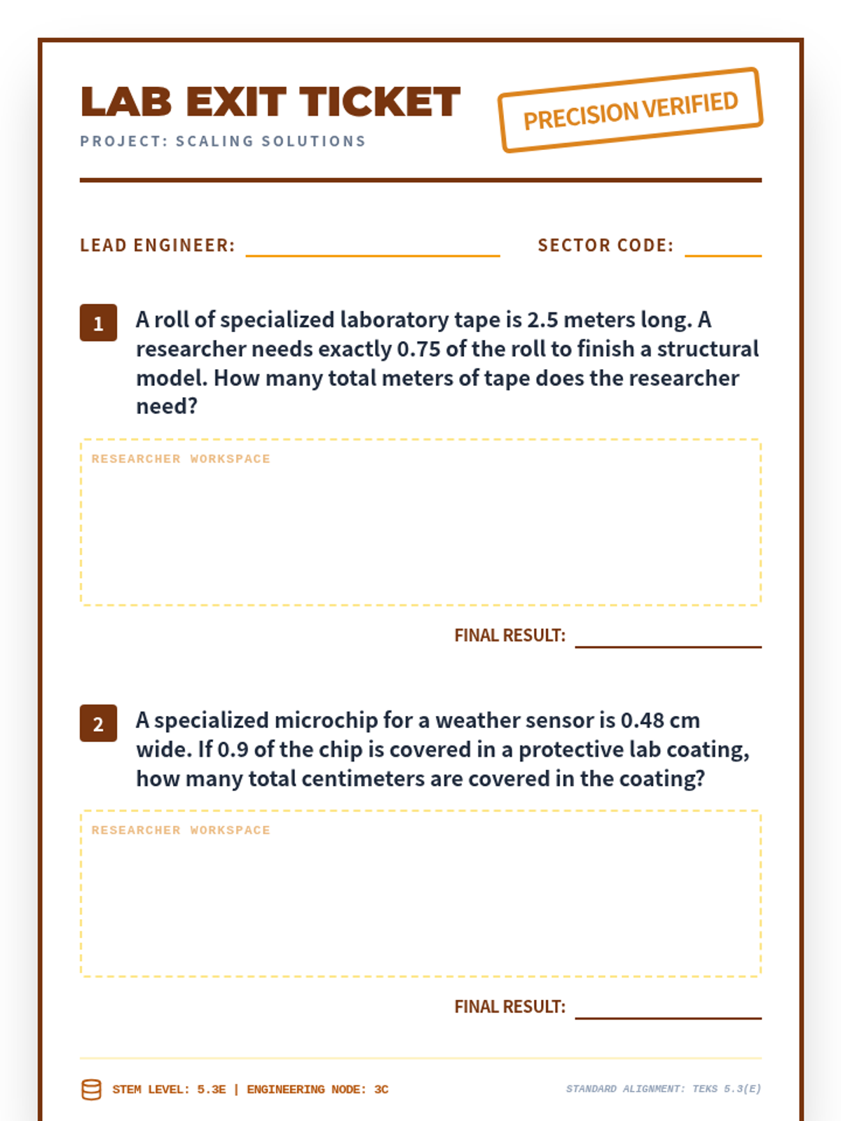 Exit ticket for Day 3 featuring two decimal multiplication word problems with dedicated computation space and final result lines. themed for STEM engineering. Fixed footer, contrast, and answer lines.