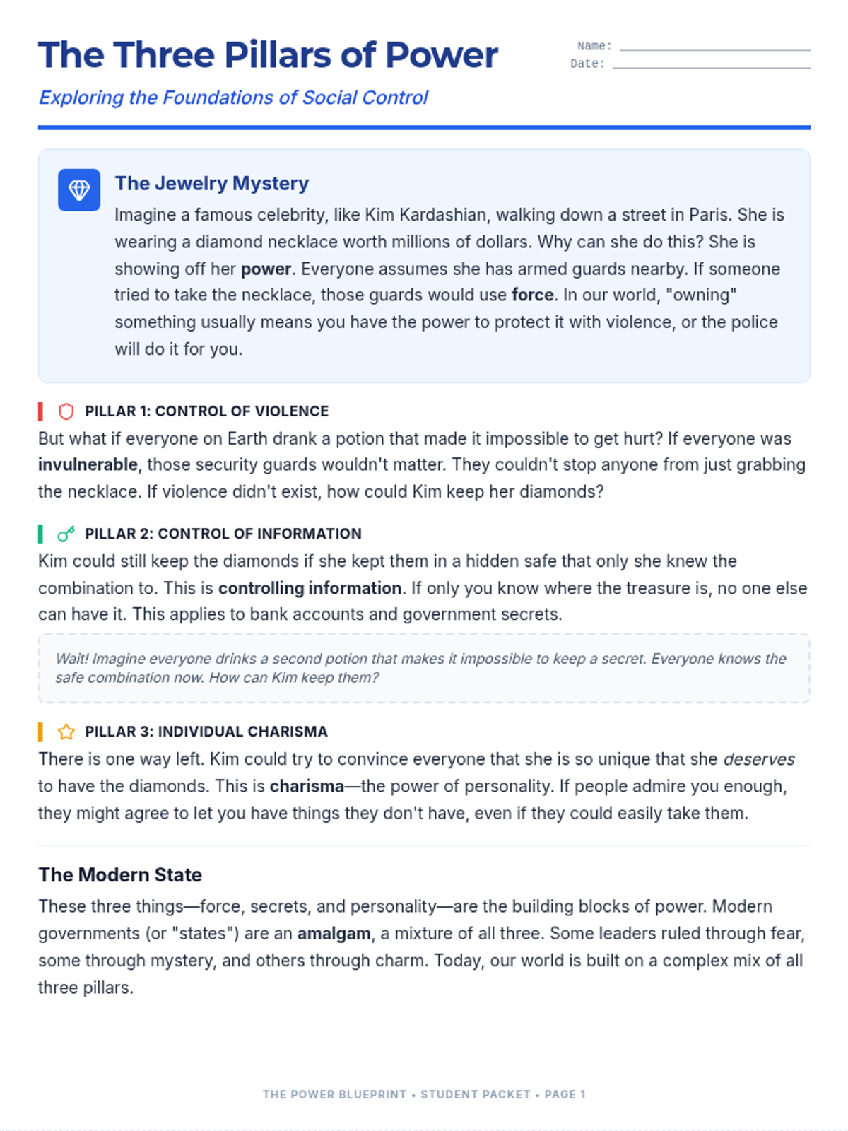 A comprehensive 2-page packet for 7th graders including a reading passage on the three pillars of power, a vocabulary glossary with example sentences, and critical thinking reflection questions.