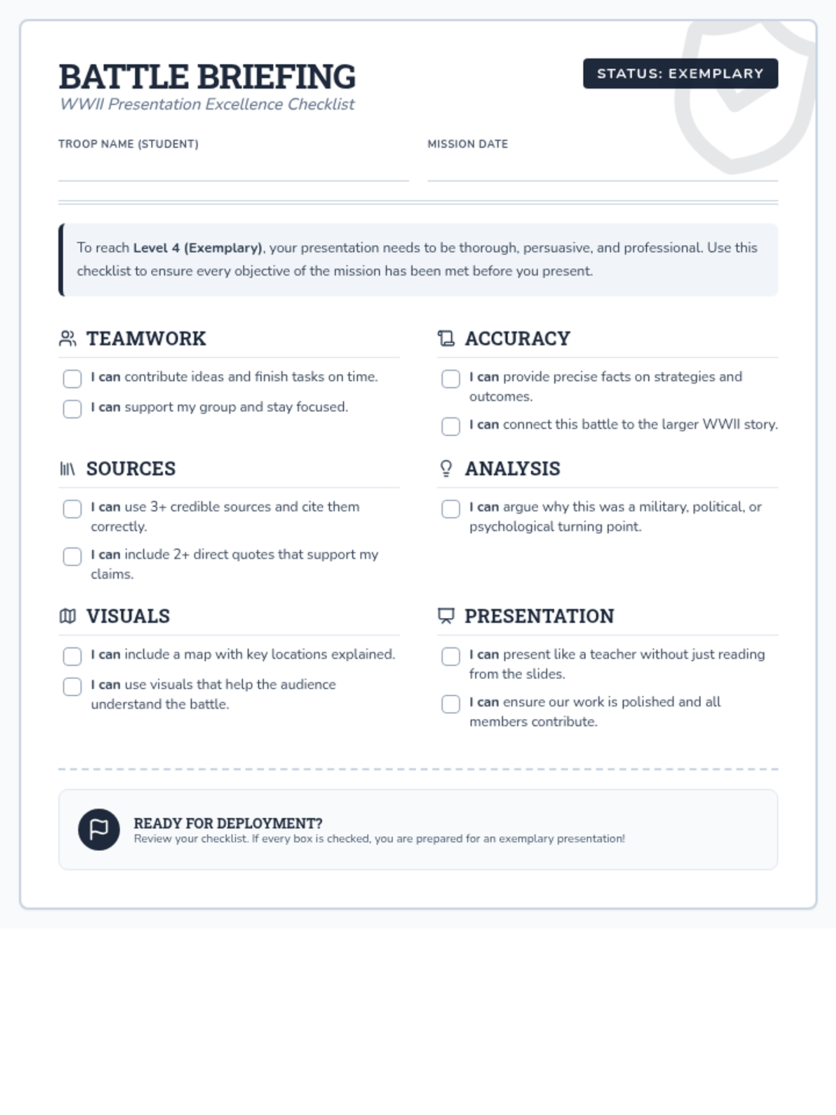 A student-friendly presentation checklist based on Level 4 criteria of a WWII Battles Project rubric, featuring 'I can' statements and visual icons. Revised to fit on a single page.