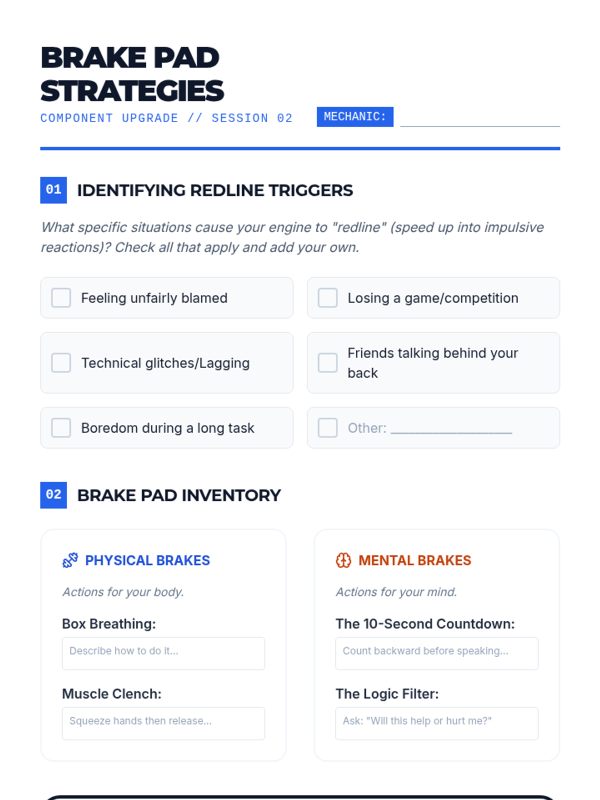 Student activity sheet for identifying personal triggers and selecting specific 'braking' strategies to manage impulsive reactions.