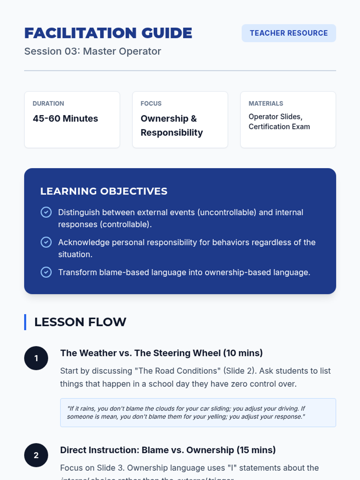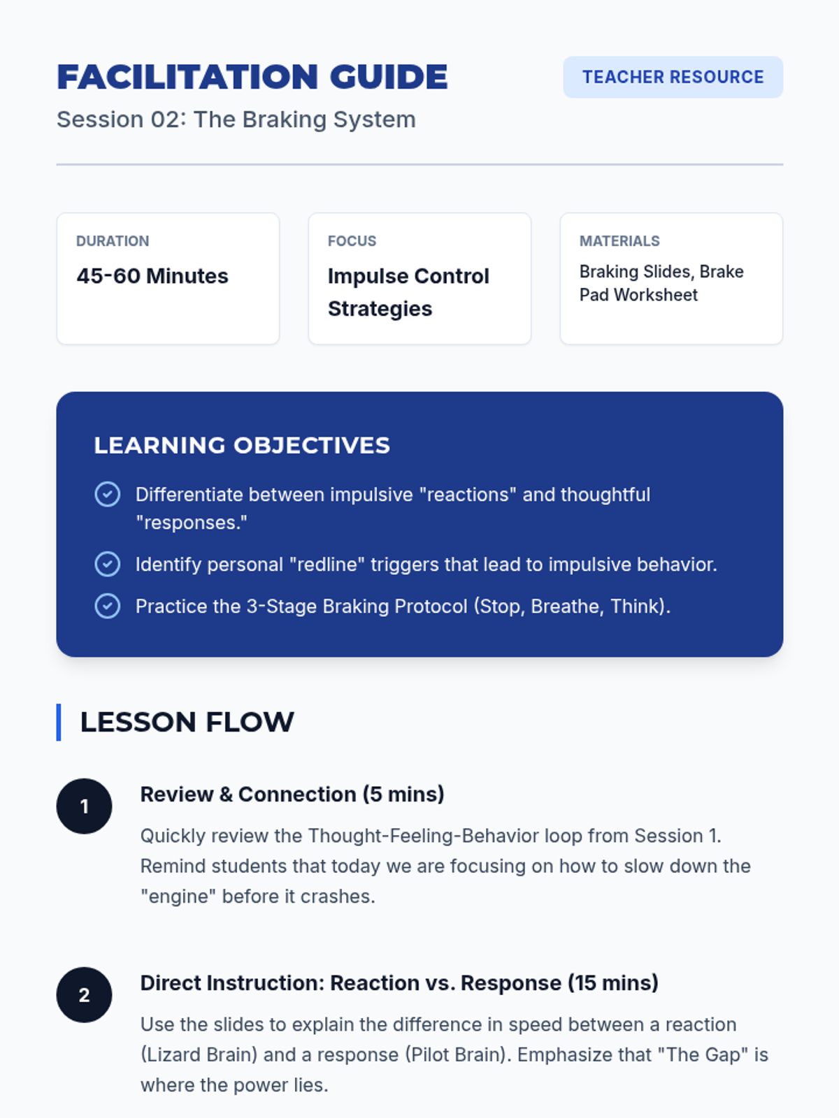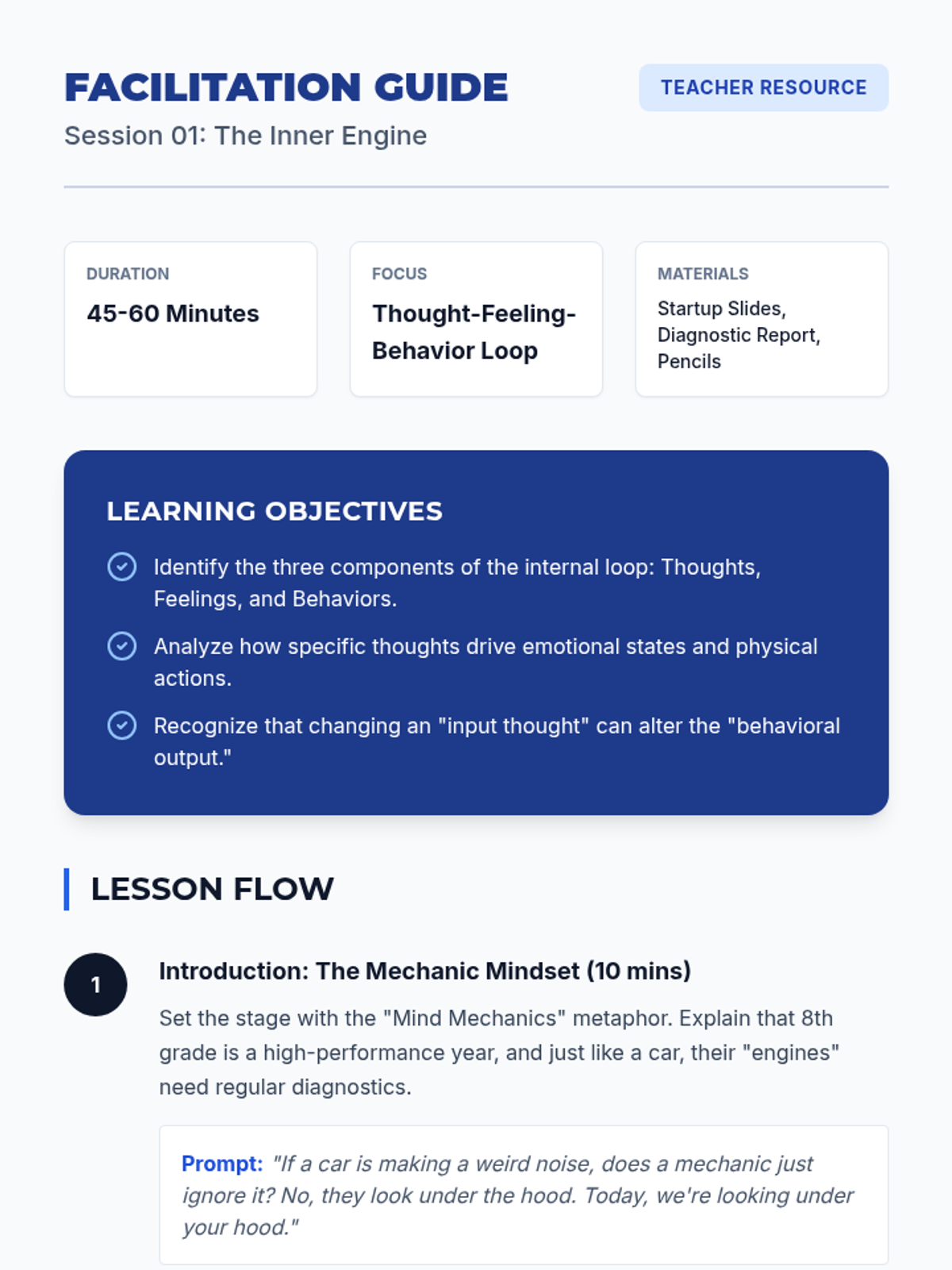 Teacher facilitation guide for Session 1, including discussion prompts, lesson flow, and tips for implementing the 'Mind Mechanics' theme.
