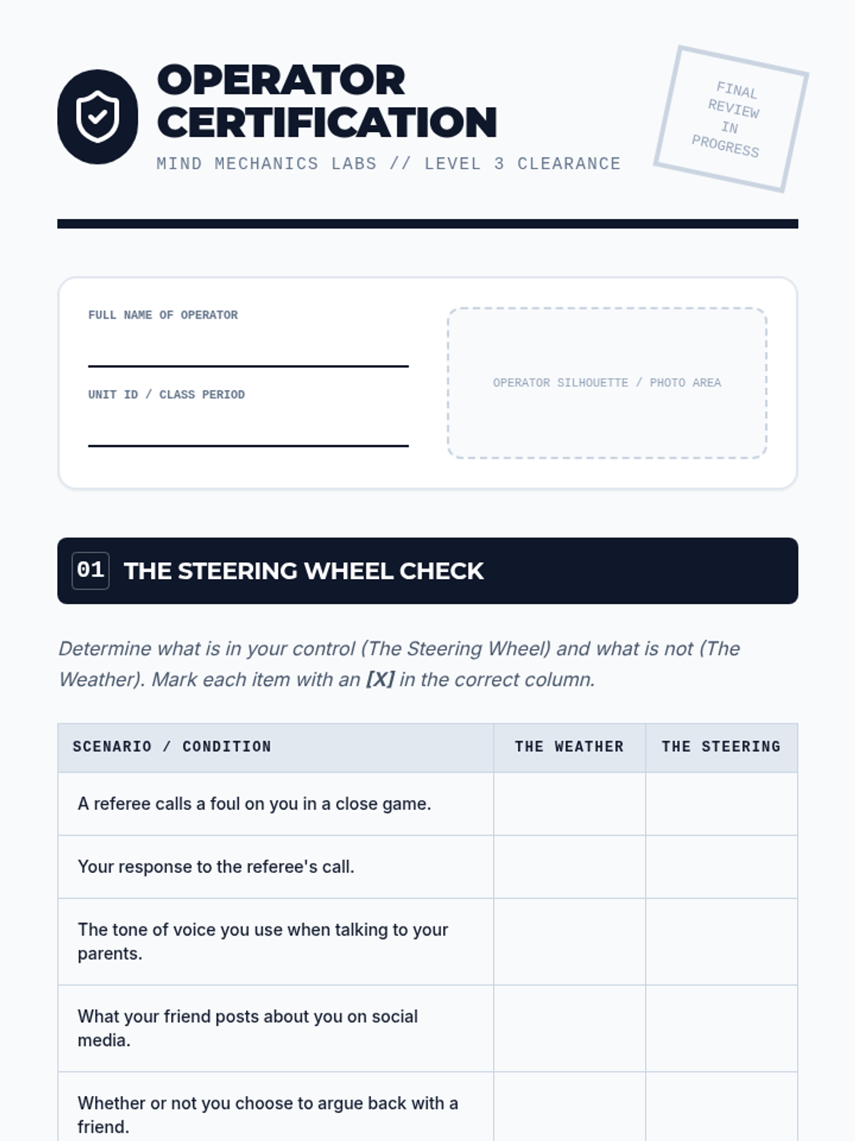 Final certification exam for the Mind Mechanics unit, assessing students' ability to identify areas of control and rewrite blame-based statements into ownership-based statements.