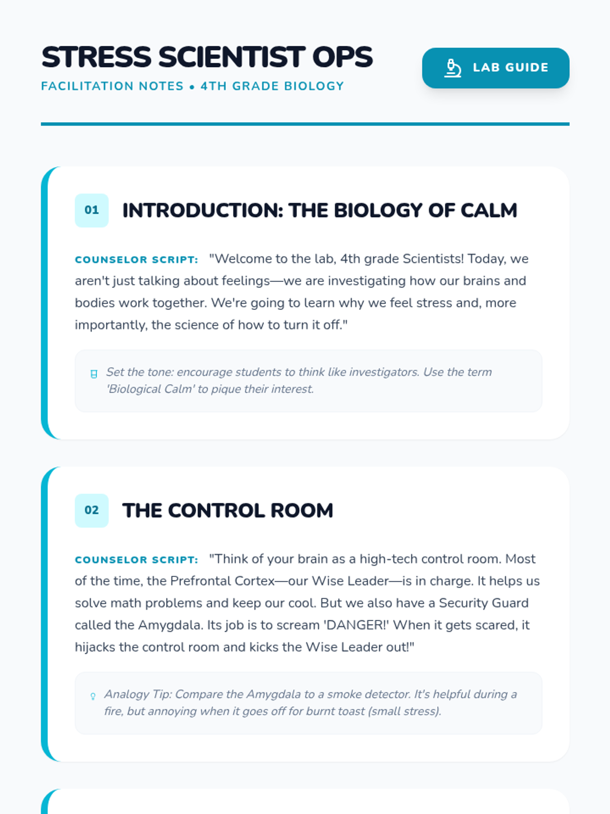 A detailed facilitation guide for the 4th grade 'Stress Scientists' lesson. Includes counselor scripts, biology-themed analogies for brain function, and interactive prompts for the 'Scientific Method' practice.