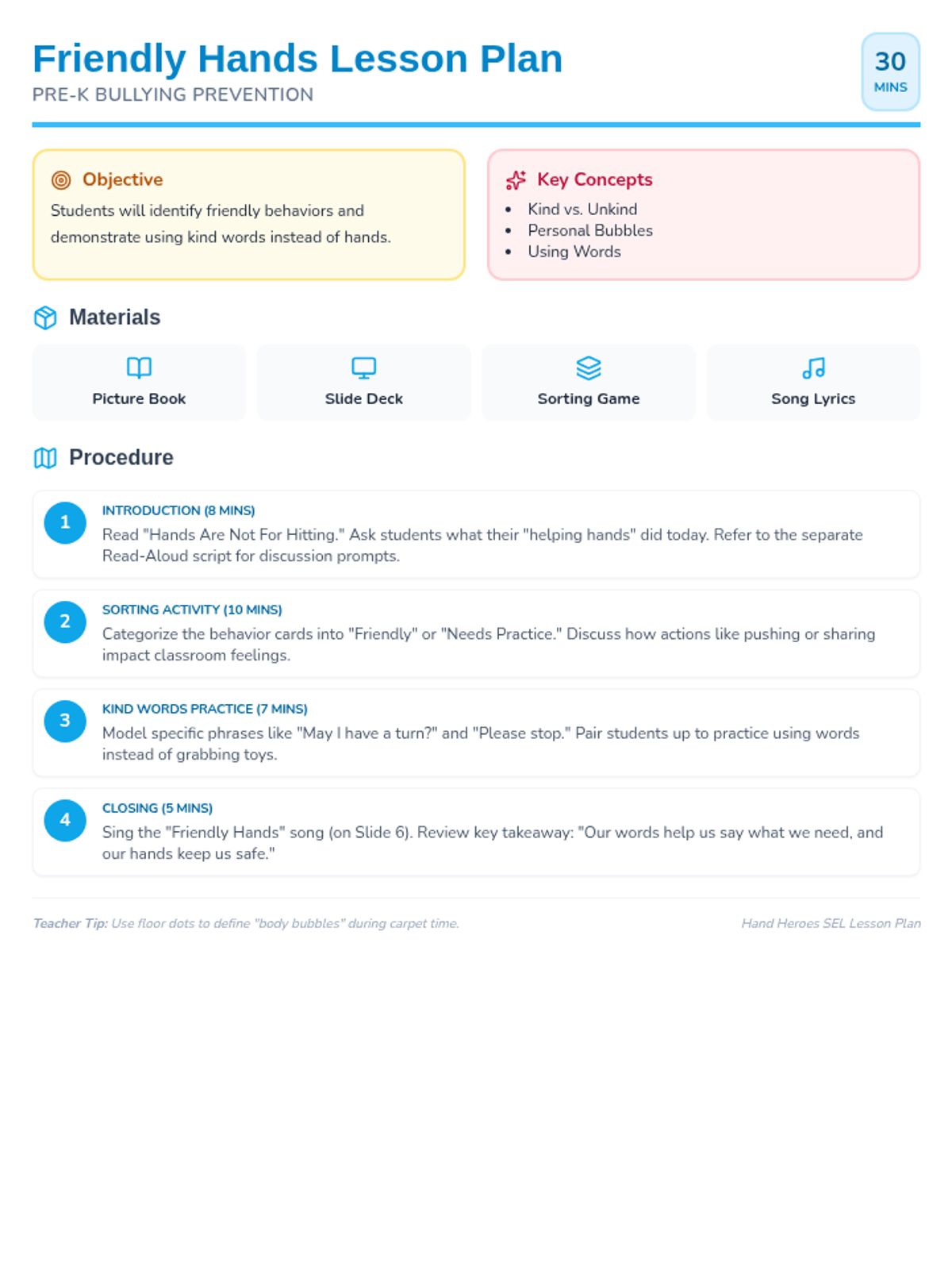 A comprehensive teacher's guide for a 30-minute Pre-K lesson on empathy and personal space. It includes a timed procedure, learning objectives, and specific teaching strategies for young learners.