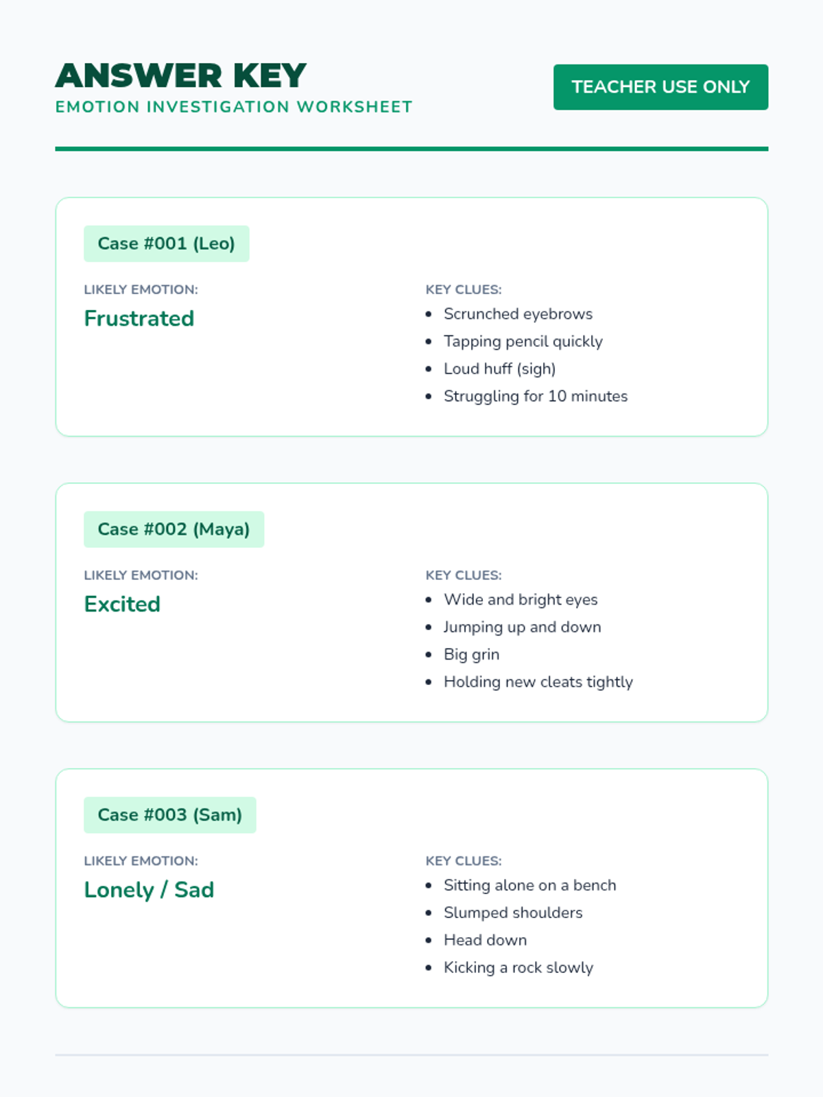 An answer key for the Emotion Investigation worksheet and exit ticket, providing suggested emotions and supporting evidence for teachers.