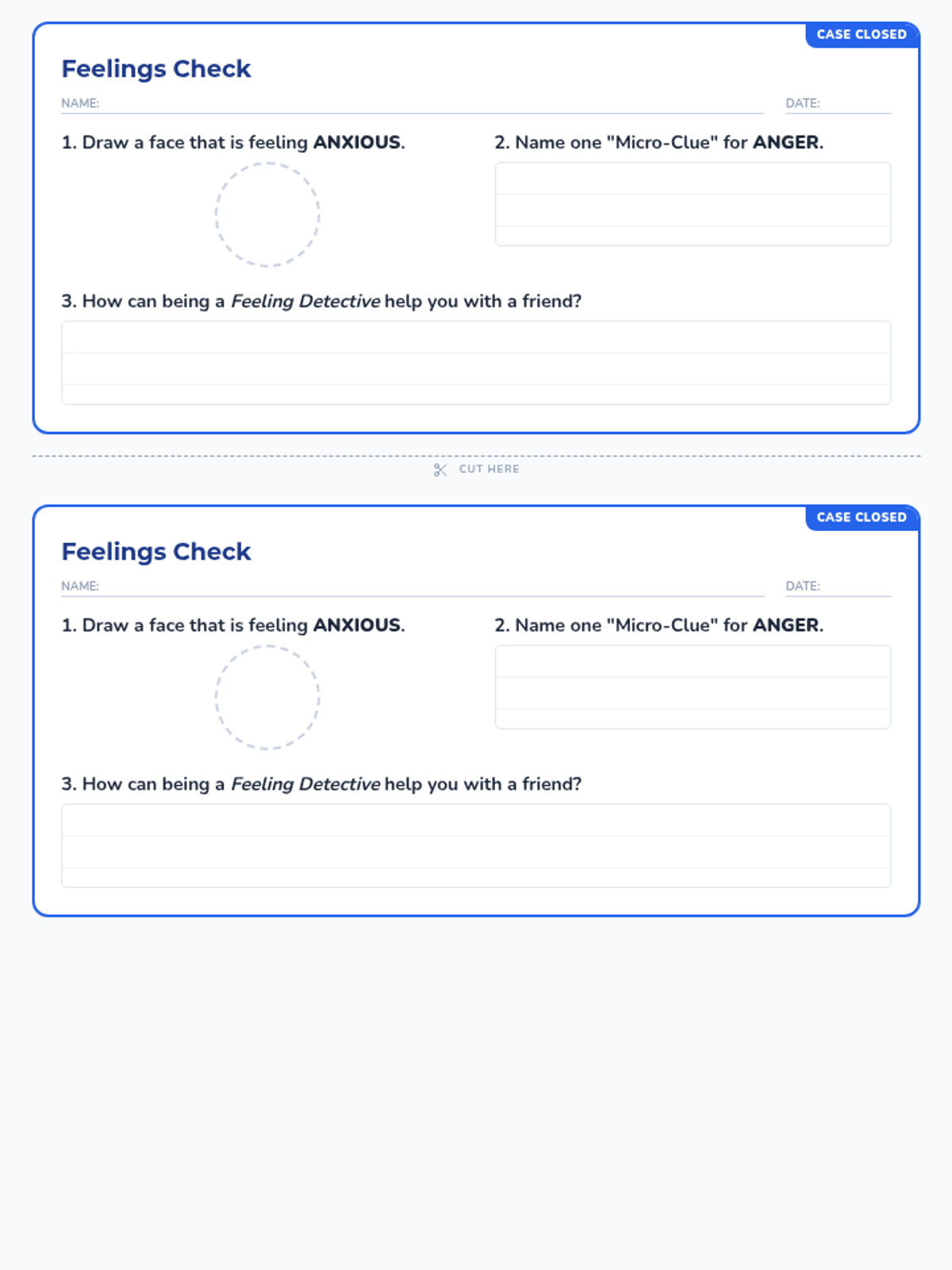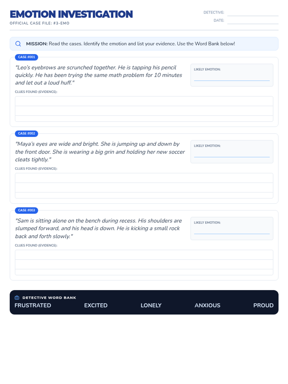 An engaging presentation for 3rd graders that introduces the concept of 'Feeling Detectives' and explains how to look for emotional clues in faces and body language. Now includes a scenario investigation slide.