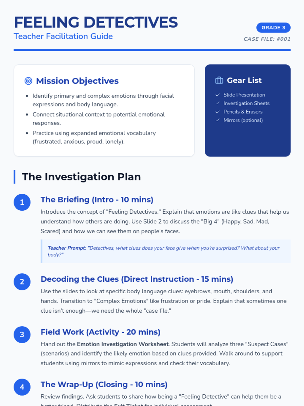 A comprehensive facilitation guide for the Feeling Detectives lesson. Revised to ensure steps don't break across pages and sidebar text wraps properly.