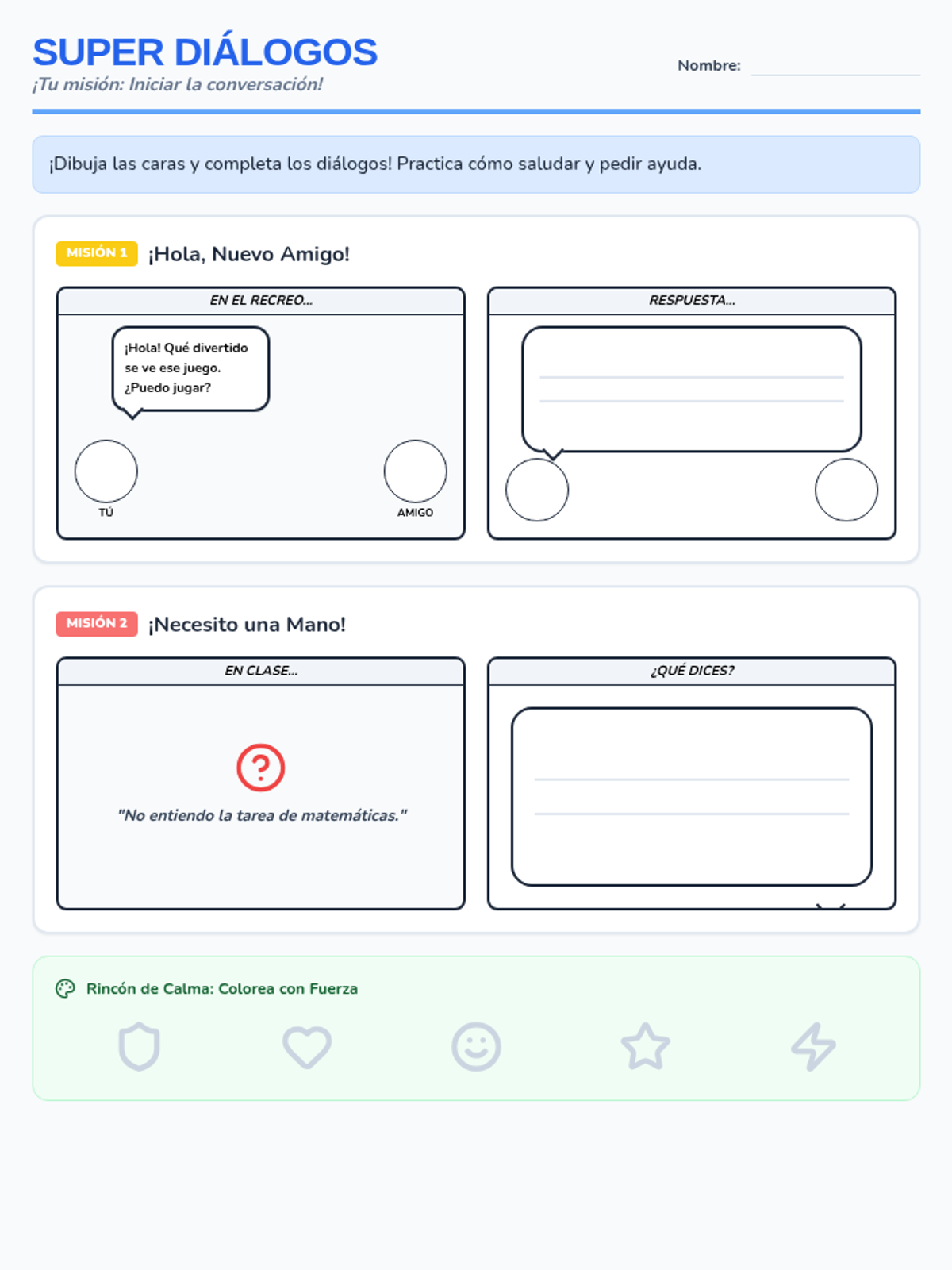 Un cómic interactivo en español para practicar el inicio de conversaciones y la solicitud de ayuda, diseñado para niños de 10 años.