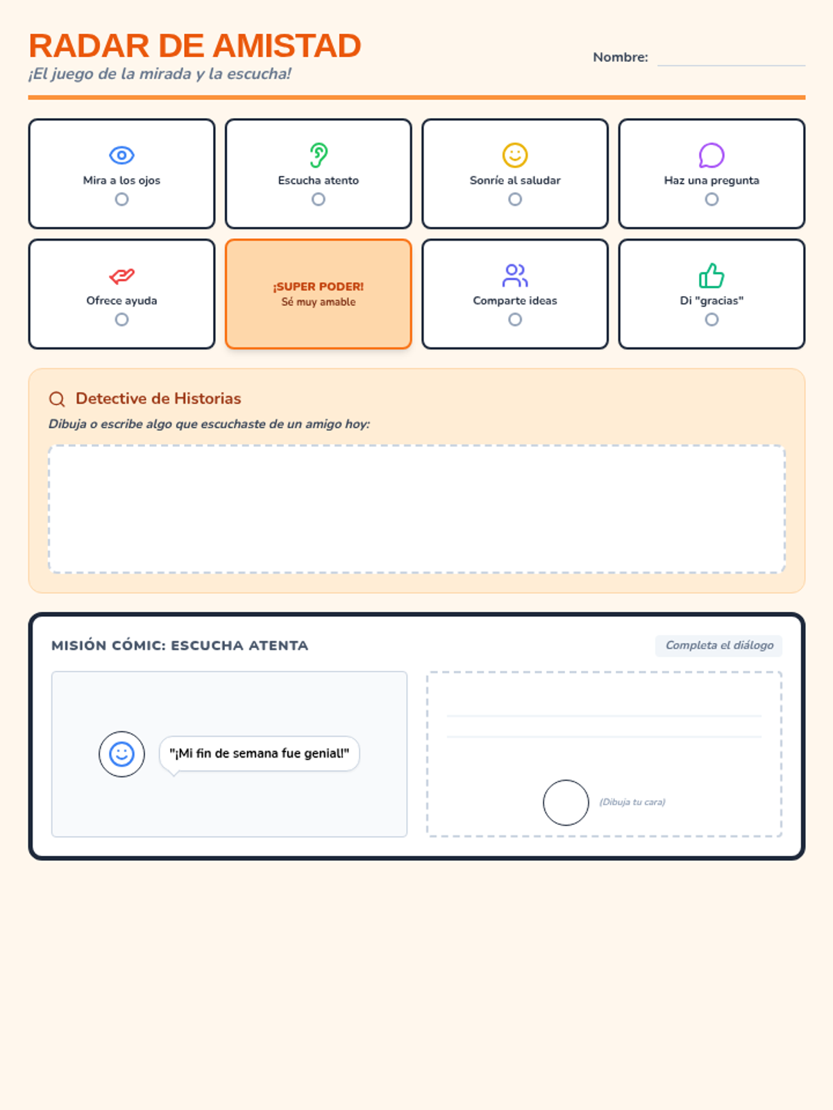 Una hoja de actividades estilo juego de mesa que enseña contacto visual, escucha activa y amabilidad en español.