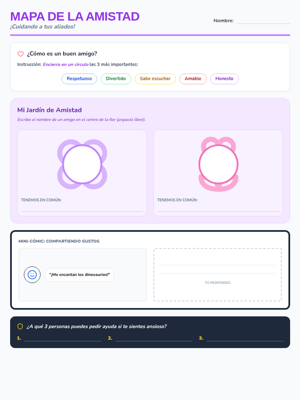 Una hoja de trabajo para identificar cualidades de la amistad, intereses comunes y redes de apoyo para niños de 10 años en español.