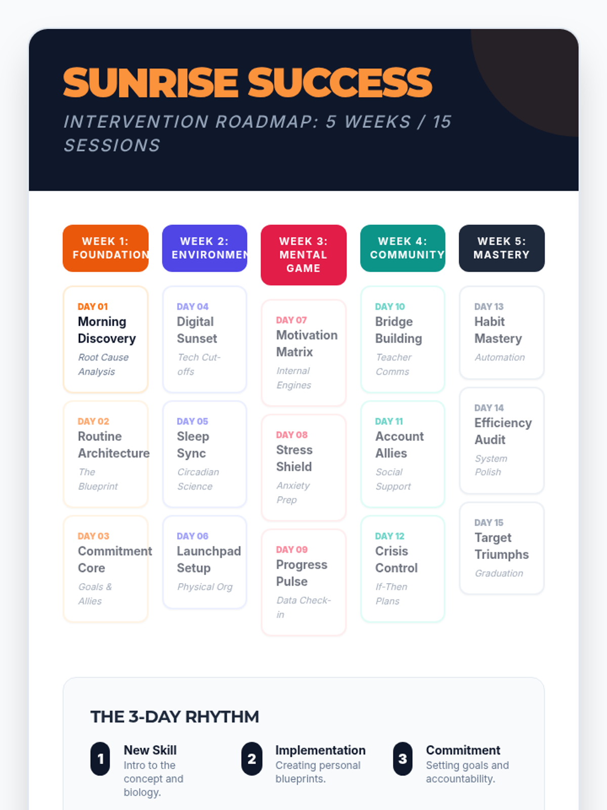 A comprehensive visual roadmap of the 15-session restorative attendance intervention, outlining the themes and daily topics across the 5-week cycle.