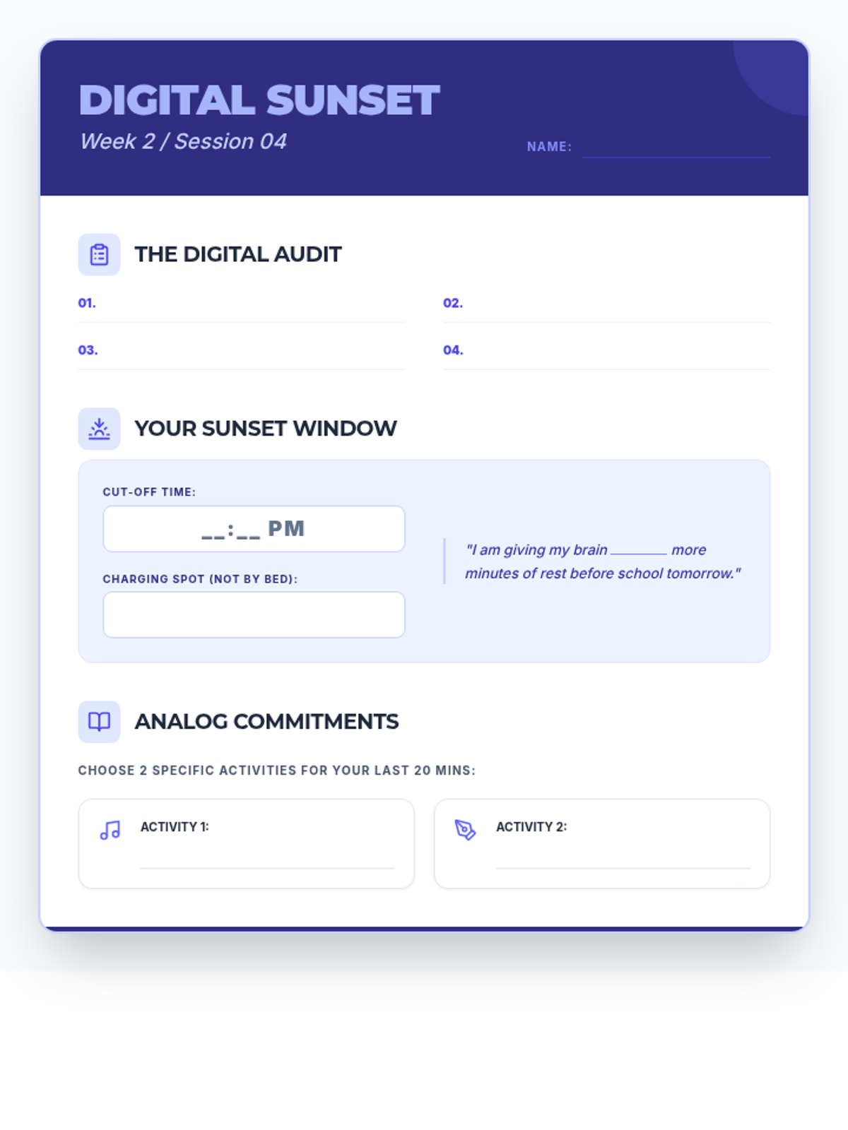 A worksheet for designing a 'Digital Sunset' window, revised to fit on a single page with larger handwriting areas and functional input spaces for analog commitments.
