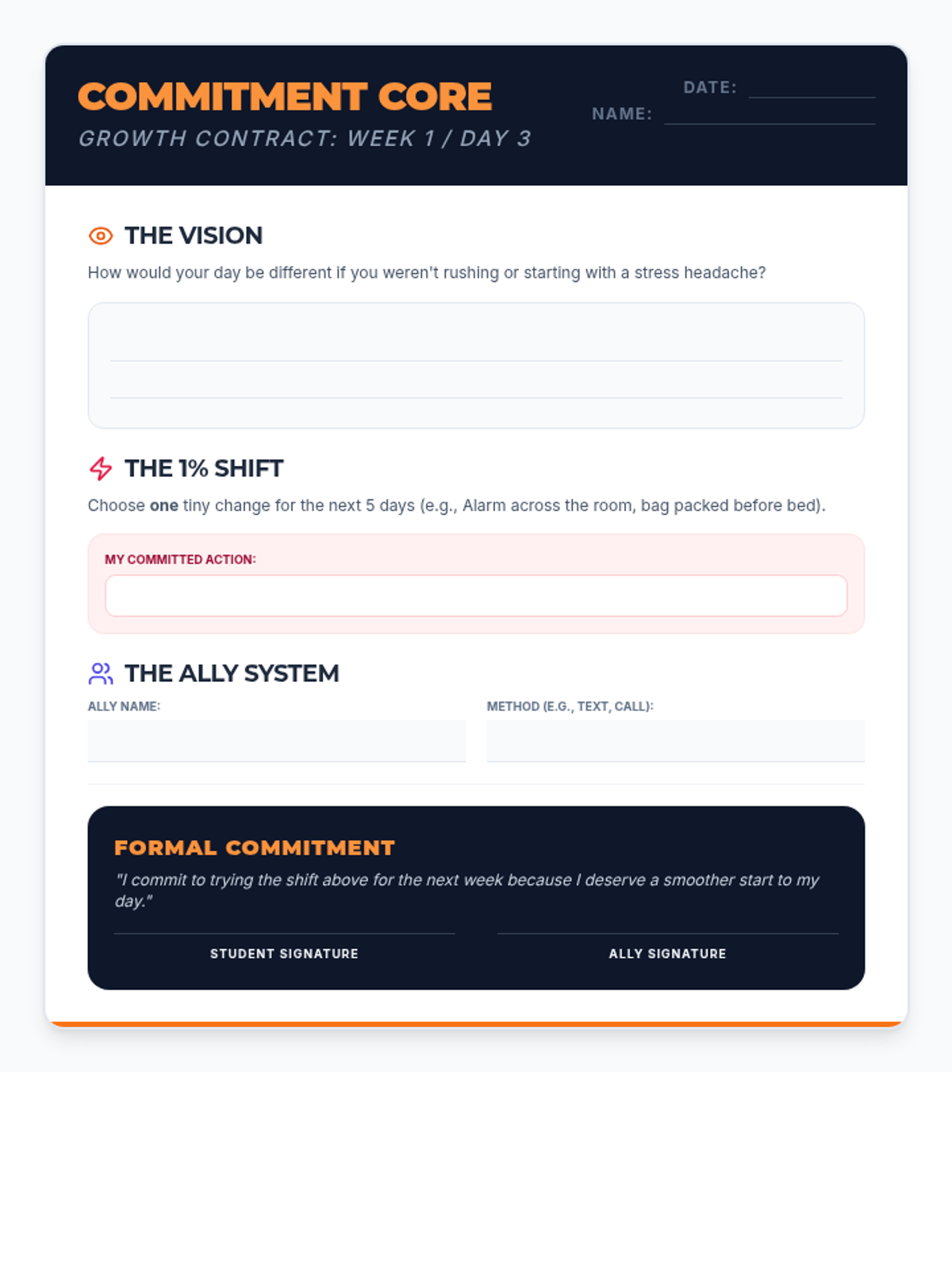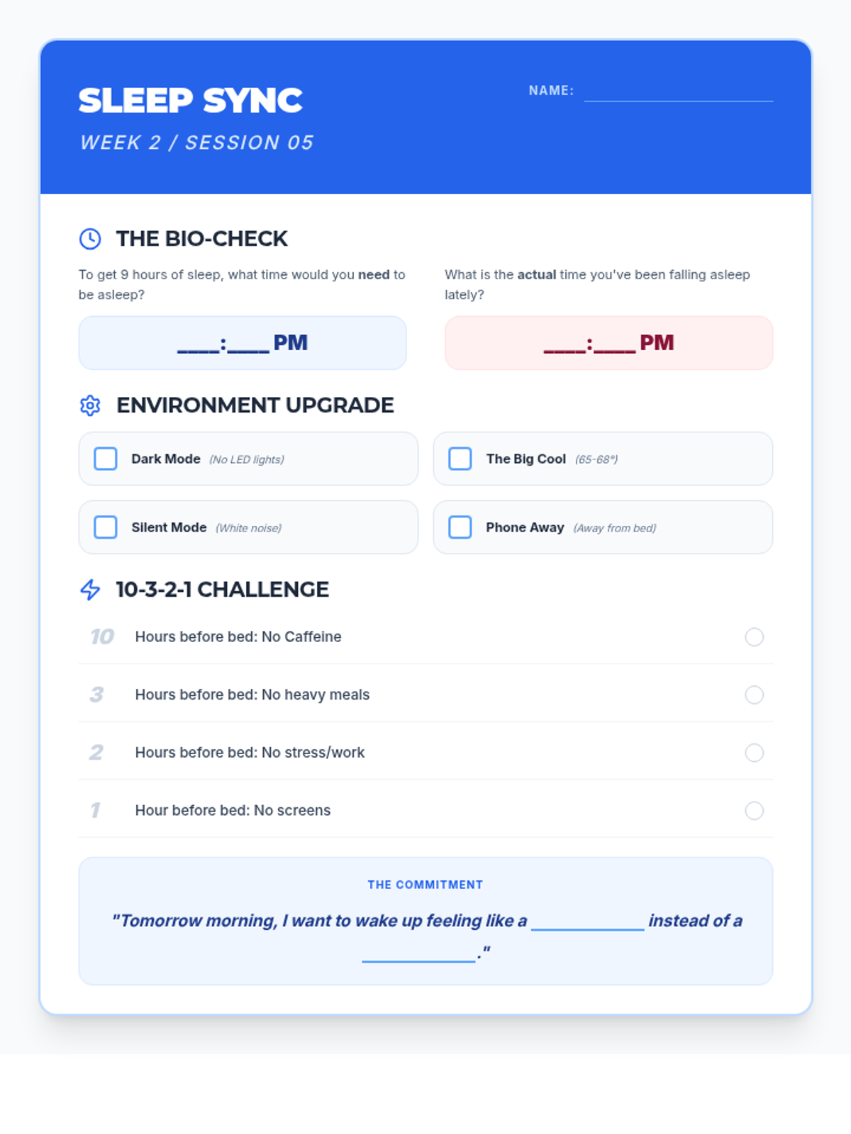 A sleep hygiene guide revised to fit on a single page, featuring improved contrast for student handwriting and functional input spaces for commitments.