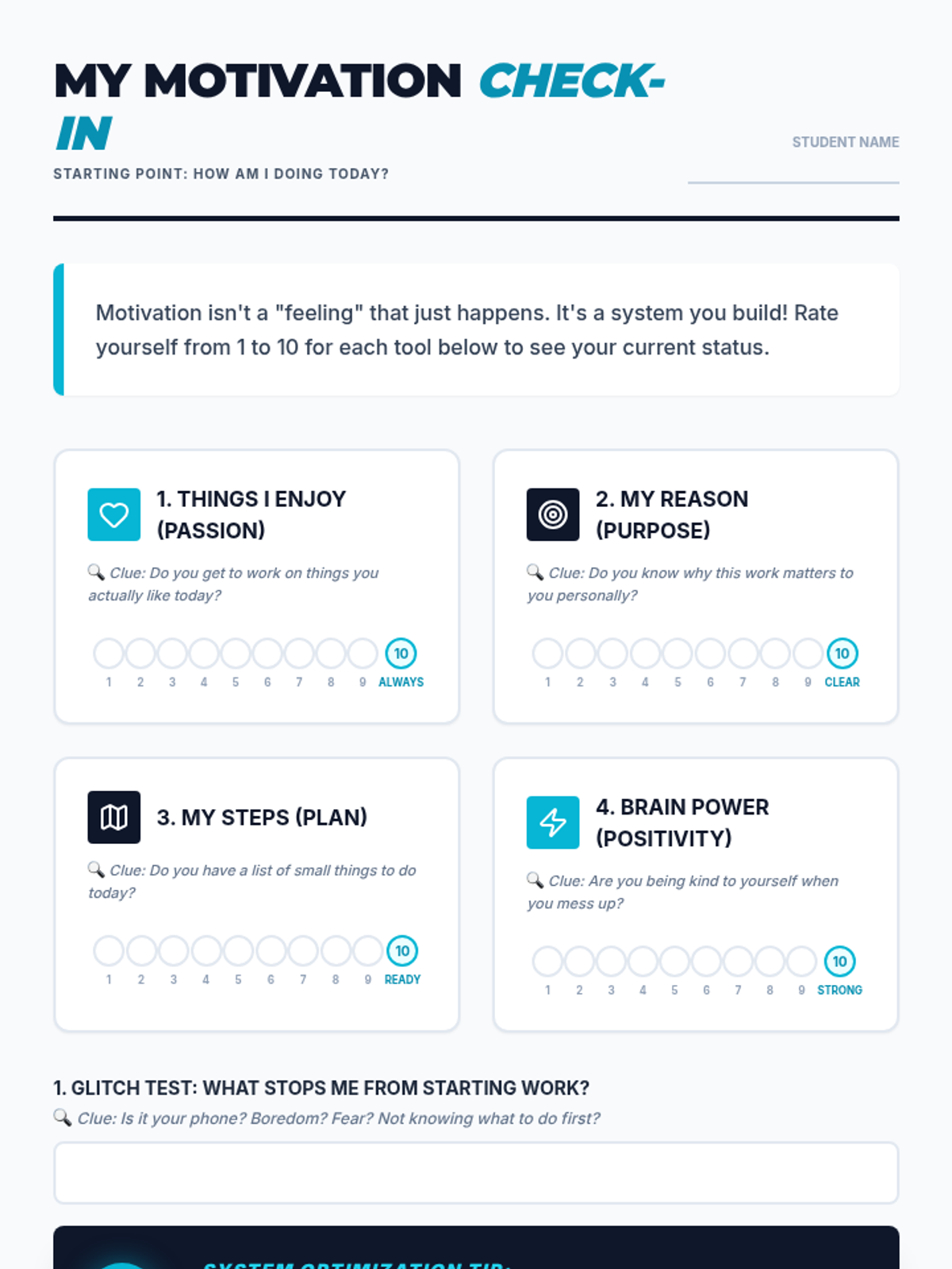 A baseline assessment worksheet for teens to rate themselves on the 4 P's (Passion, Purpose, Plan, Positivity) and identify their primary motivation blockers. Revised to fit one page and fix layout issues.