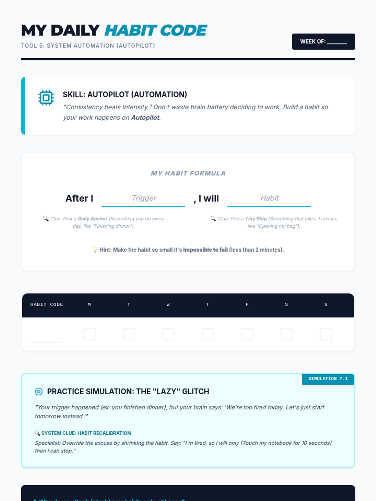 A comprehensive habit tracking tool for teens, including space for focus habits, daily motivation logs, and a weekly reflection area.