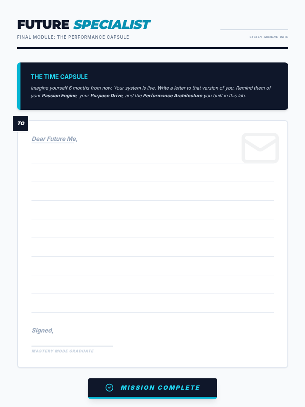 A reflective letter-writing activity for the capstone session, where students write a message to their future selves about their goals and the 4 P's strategy.
