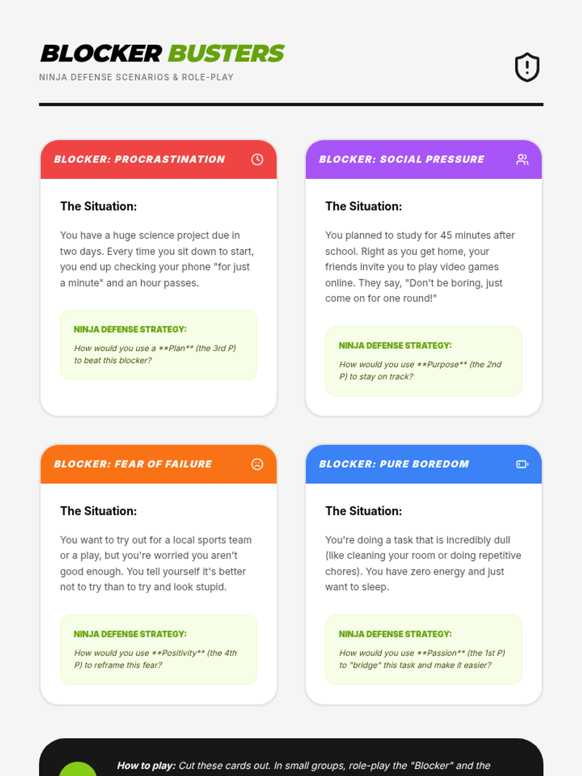 Role-play scenario cards for Lesson 6, providing students with common motivation blockers (fear, boredom, social pressure) and asking them to apply the 4 P's strategies to overcome them.