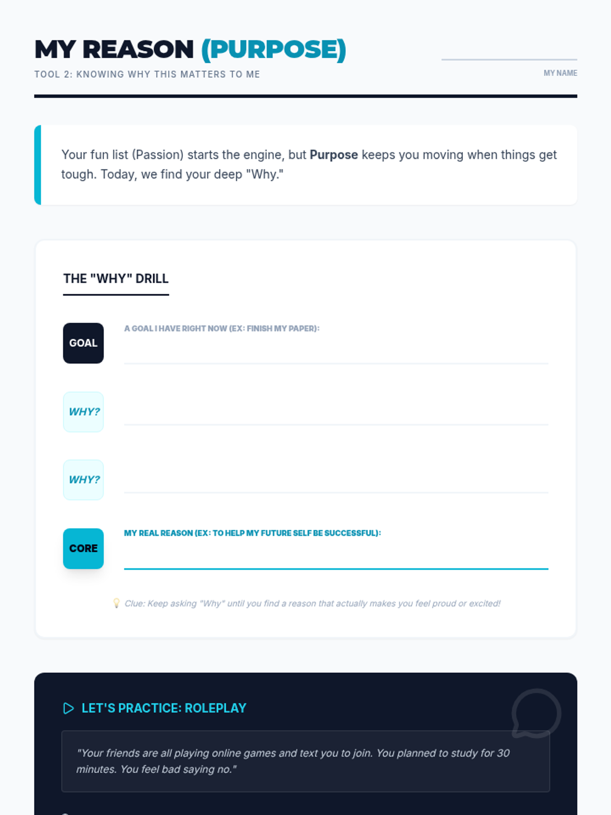 A reflective journaling worksheet that uses the '5 Whys' technique to help teens uncover the deeper purpose behind their goals and daily actions.