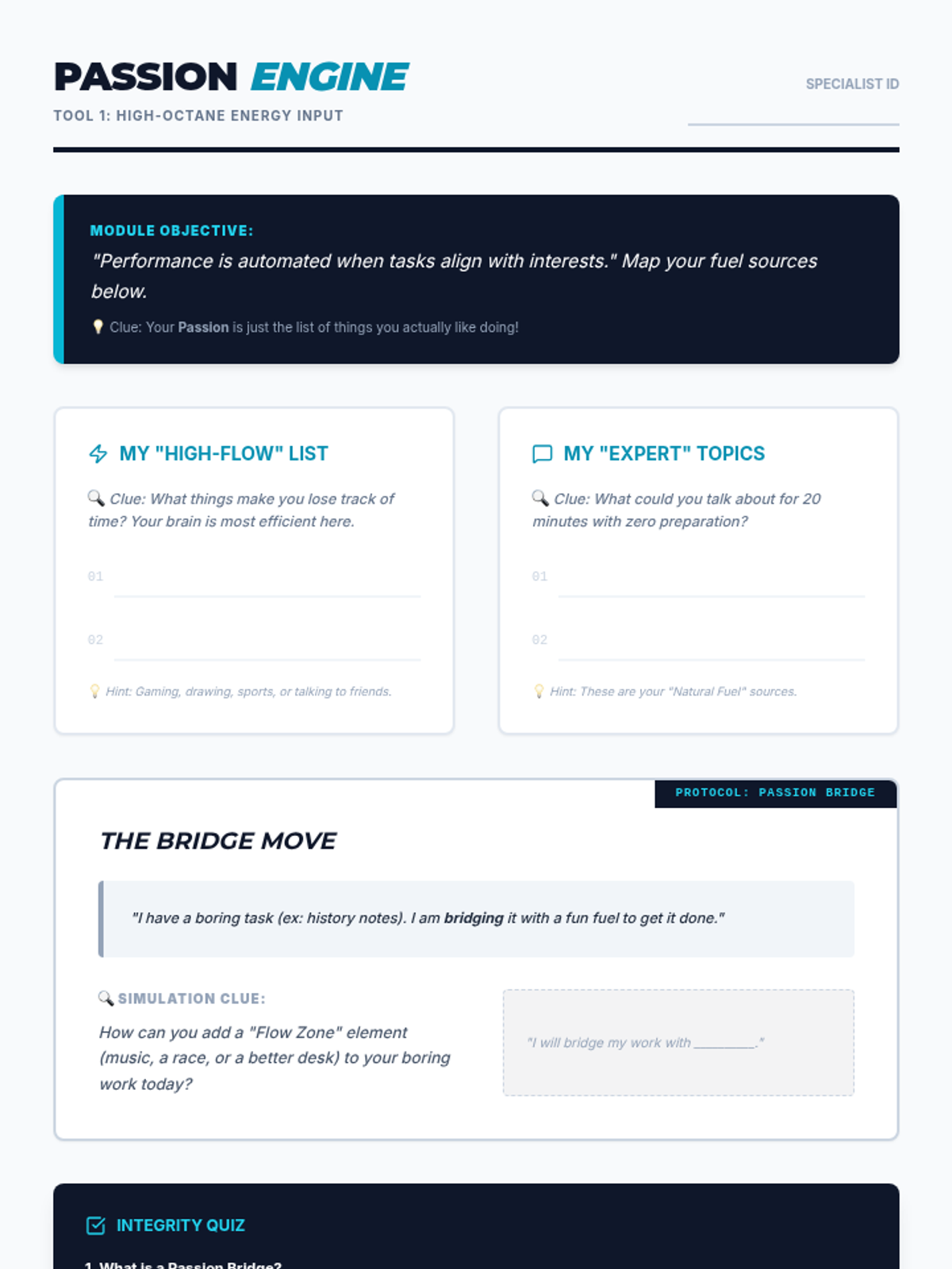 A passion exploration worksheet for teens to identify their core interests and find creative ways to 'bridge' those passions with less exciting daily tasks.