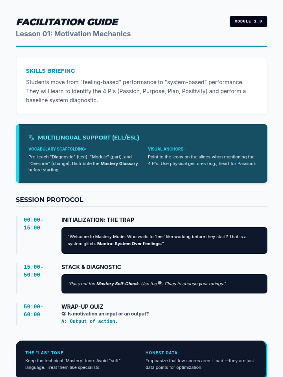 A comprehensive facilitator's guide for Lesson 1. Revised to fit a single page, improve text contrast, and avoid awkward page breaks.