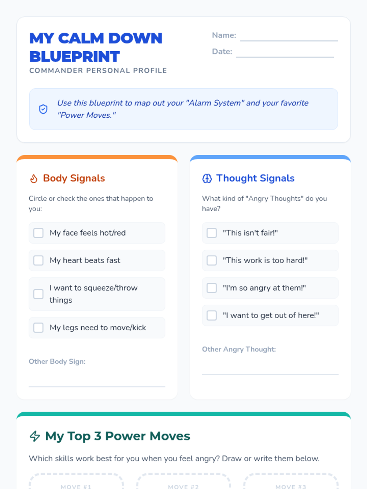 A student worksheet to accompany the social stories slides, allowing the child to personalize their physical warning signs, angry thoughts, and favorite coping strategies. Revised with improved spacing and handwriting areas.