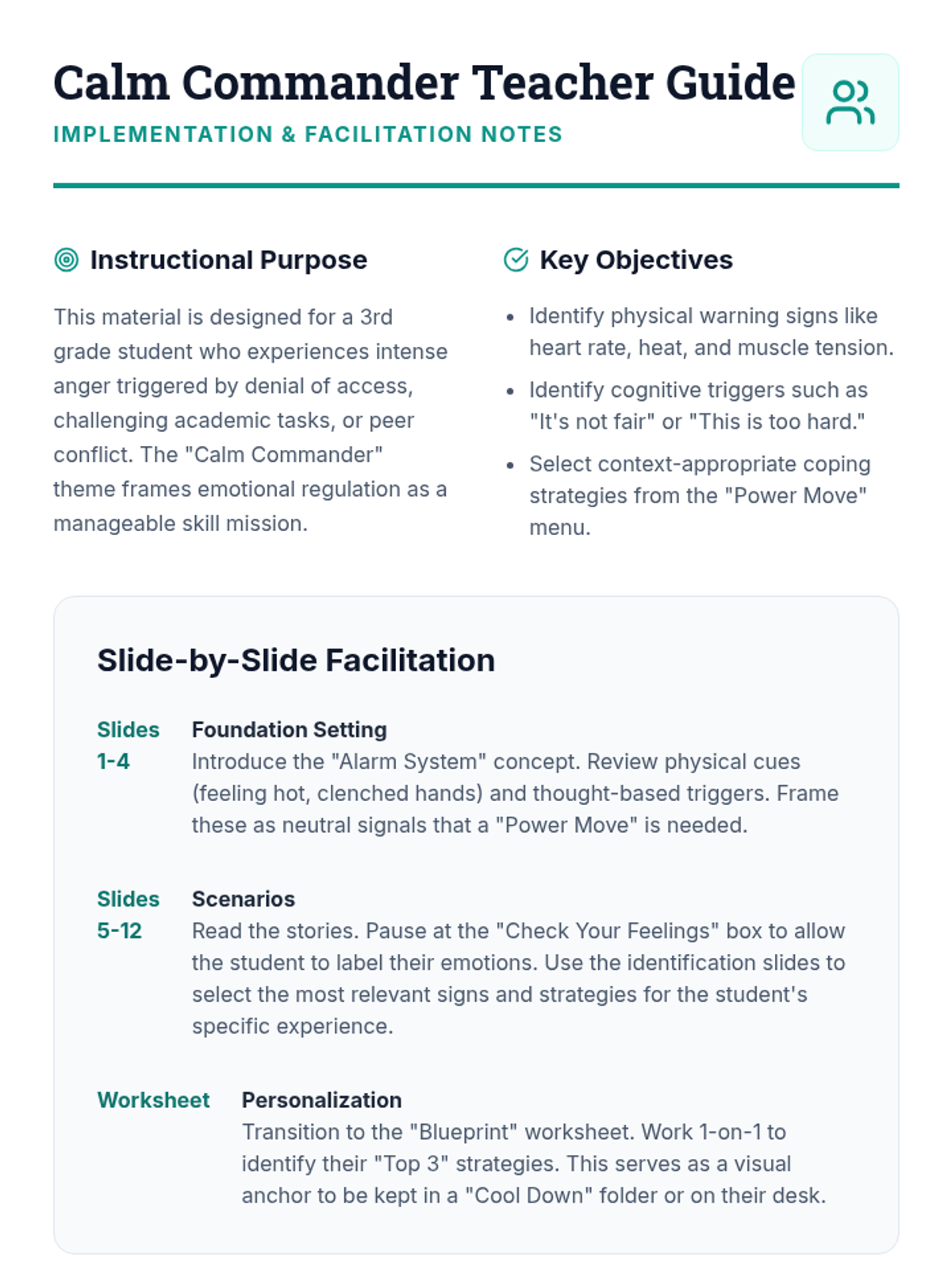 Teacher notes and facilitation guide for the Calm Commander emotional regulation lesson, revised for improved layout and removal of meta-content.