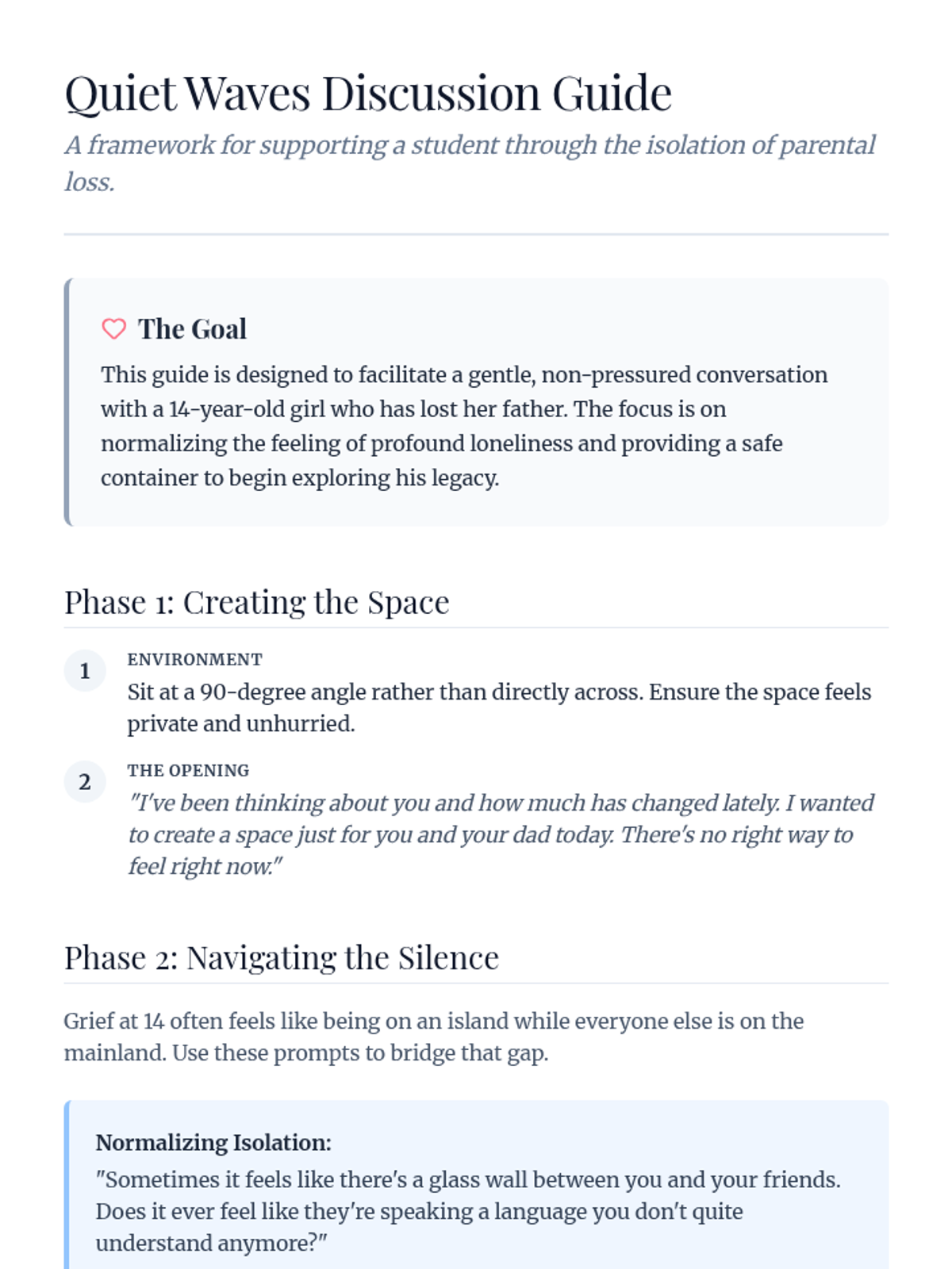 A teacher/counselor framework for conducting a sensitive discussion with a grieving teenager, focusing on the specific challenges of isolation and parental loss.