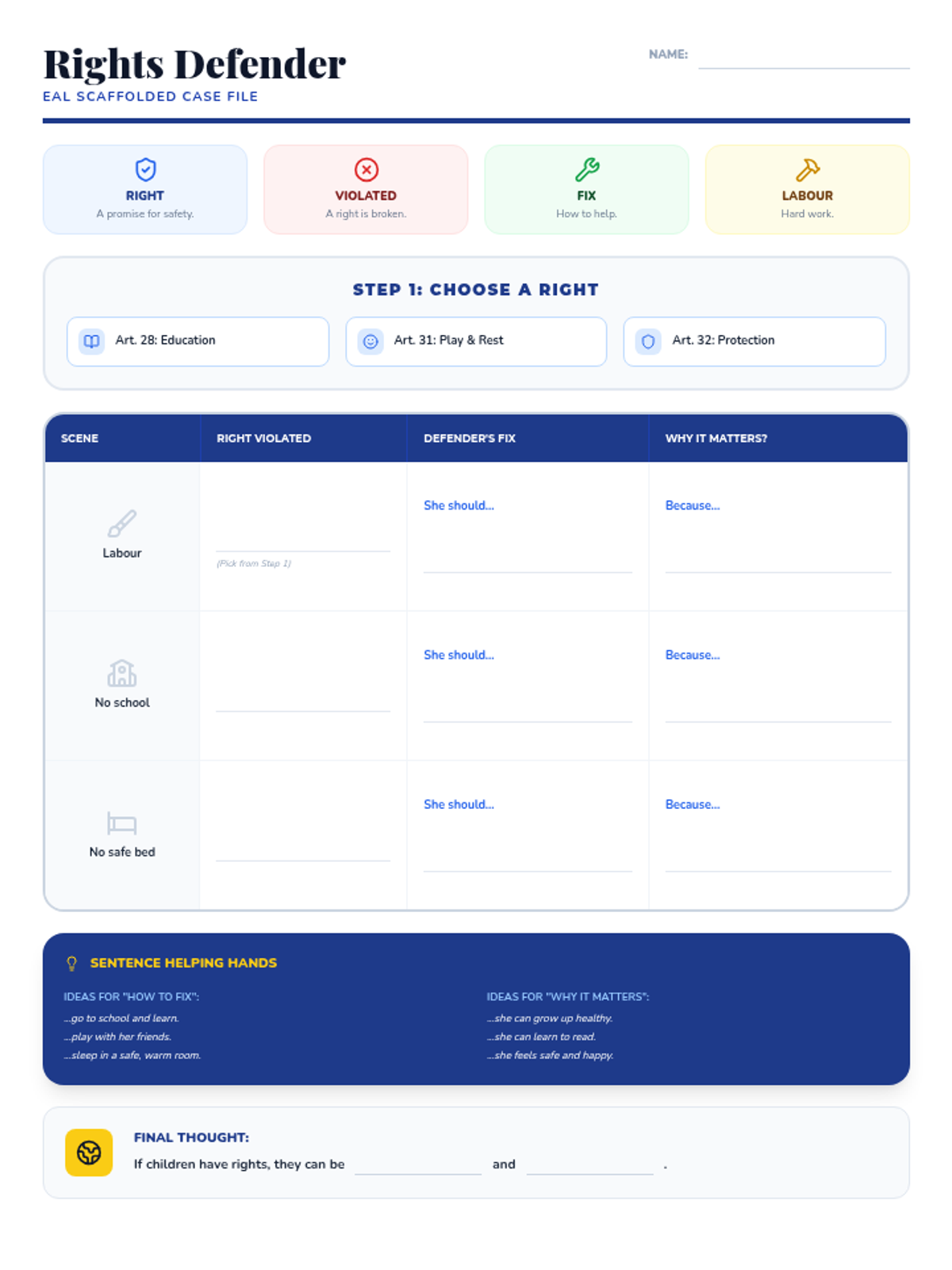 A heavily scaffolded, visual version of the P4 Human Rights activity for EAL learners. Features visual vocabulary, sentence stems, and simplified word banks for all columns. Optimized for a single page.